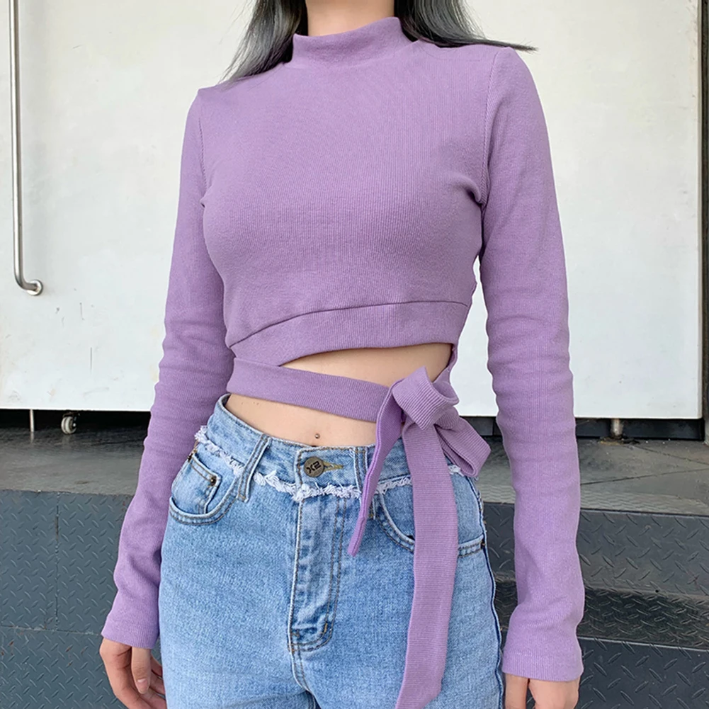 Новинка 2020, обманка, 2 предмета, короткий топ с длинным рукавом и лямкой через шею, футболка на завязках, фиолетовая Повседневная хлопковая футболка, женские модные футболки с рюшами17,19 долл. США