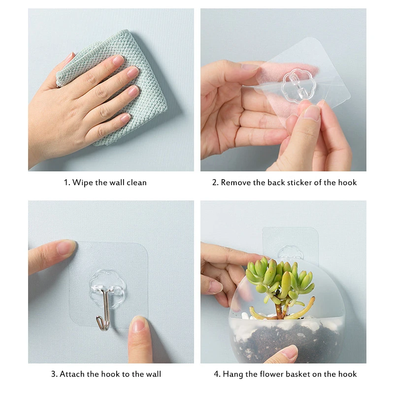 Способ установки: 1. Протрите стену чистой. 2. Оторвите клей на задней части крючка и приклейте его к стене. 3. Нажмите на крючок, чтобы выжать воздух. 4. Повесьте цветочный горшок на крючок