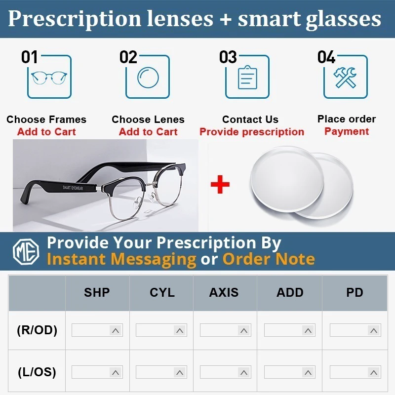 Хорошие новости: мы можем настроить линзы по рецепту/поляризованные солнцезащитные очки/цветные линзы/линзы пресбиопии и линзы по рецепту обесцвечивания для этих умных очков. Если вам они нужны, пожалуйста, нажмите на ссылку ниже, чтобы узнать и заказать линзы по рецепту, и обратите внимание на свой список рецептов в заказе, или оставьте список рецептов нашему персоналу службы поддержки клиентов