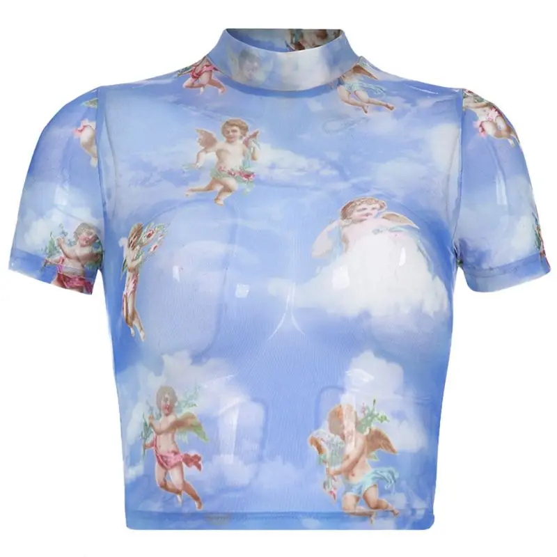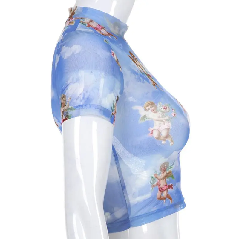 Короткие рукава, ложная горловина, водолазка, сексуальная прозрачная сетка, графический Красочный Ангел Амур шаблон цифровой печати.