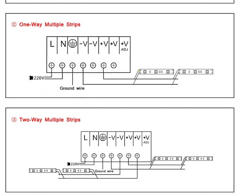 Мы предлагаем индивидуальный светодиодный дизайн. Если вы не знаете, как сочетать или что купить, свяжитесь с нашей службой поддержки клиентов. Характеристики: 100% испытание на полную нагрузку. Универсальный вход переменного тока/полный диапазон. Хорошее качество и высокая производительность. Вход: AC110-220V 50/60 Гц. Защита: перегрузка/перенапряжение/короткое замыкание. Охлаждение путем свободной конвекции воздуха. (Не рекомендуется для использования в ванной комнате) Подключение: L, N: вход питания переменного тока GND: выходная мощность постоянного тока "-" V: выходная мощность постоянного тока "+" + V / ADJ: Регулировка выходного напряжения Соответствие безопасности: CCC/ FCC / CE Рабочая температура: 0 ~ 40 градусов. Температура хранения: -20 ~ 60 градусов Влажность окружающей среды: 0 ~ 95% без конденсации Соответствие безопасности: FCC / CE /Rohs