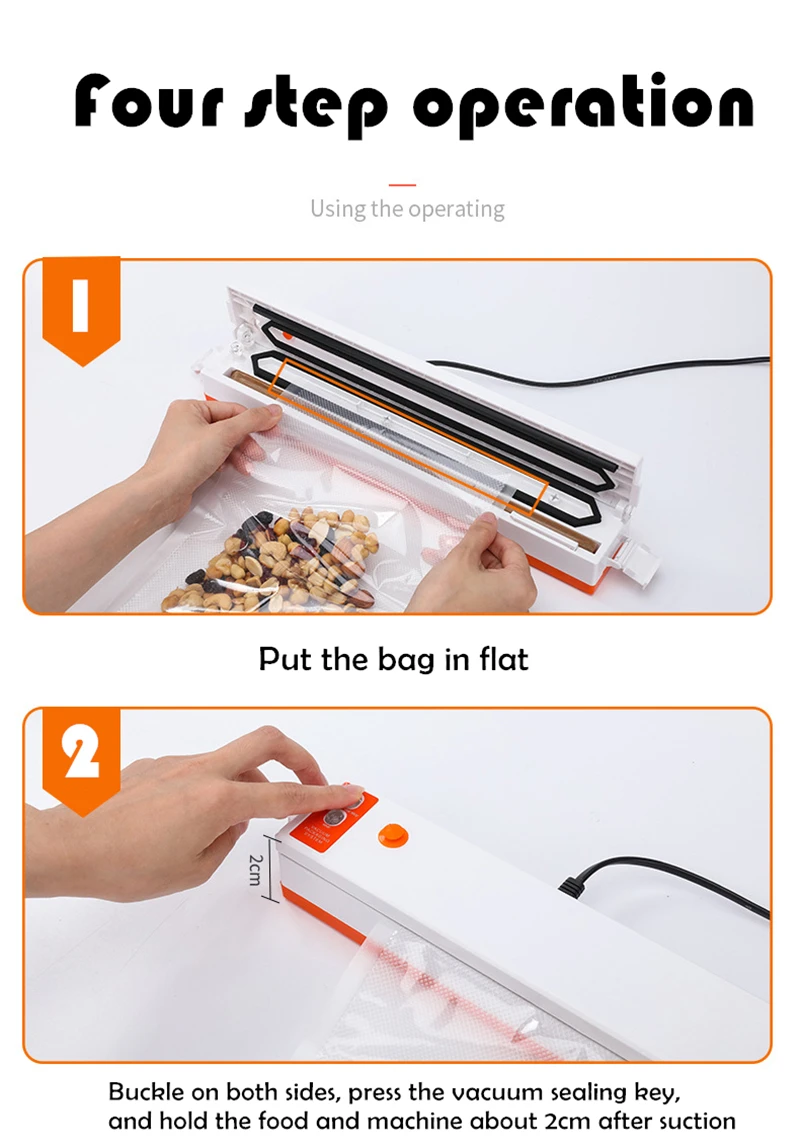 1. Положите сумку в плоскую 2, пряжка с обеих сторон, нажмите вакуумный ключ запечатывания, и удерживайте еду и машину около 2 см после всасывания 3, жаркое, выпускной клапан 4. Проверка и отделка