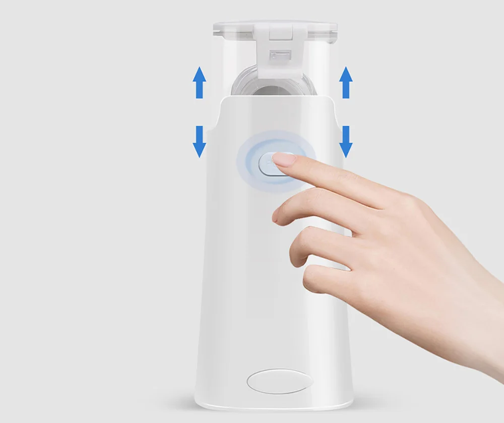 1. Откройте крышку чашки, налейте жидкое лекарство в чашку с лекарствами, закройте крышку и плотно закройте крышку. 2. Один ключ для запуска переключателя 3. Туман начинает распыляться.