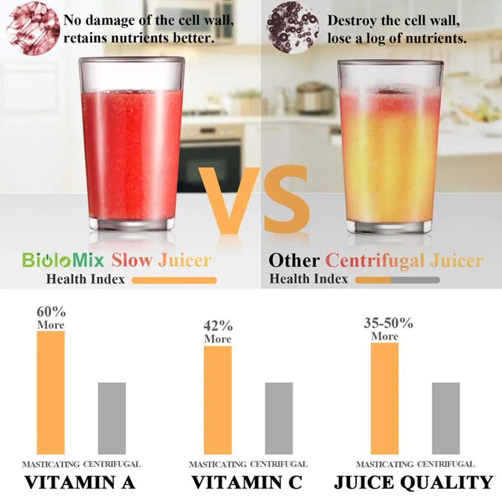 2. Максимальное значение нутриона-наша соковыжималка с двигателем 200 Вт вращается на 40 об/мин, что более медленно и мощнее, чем другие медленные соковыжималки на рынке, меньше тепла и минимальное окисление, сохраняет максимальное питание от фруктов и овощей, выход сока до 90%.