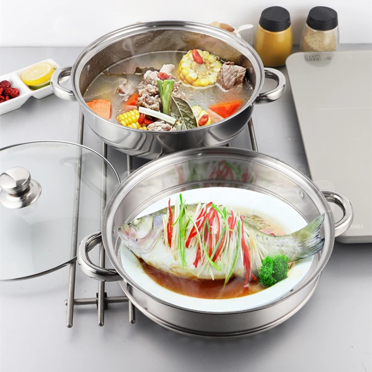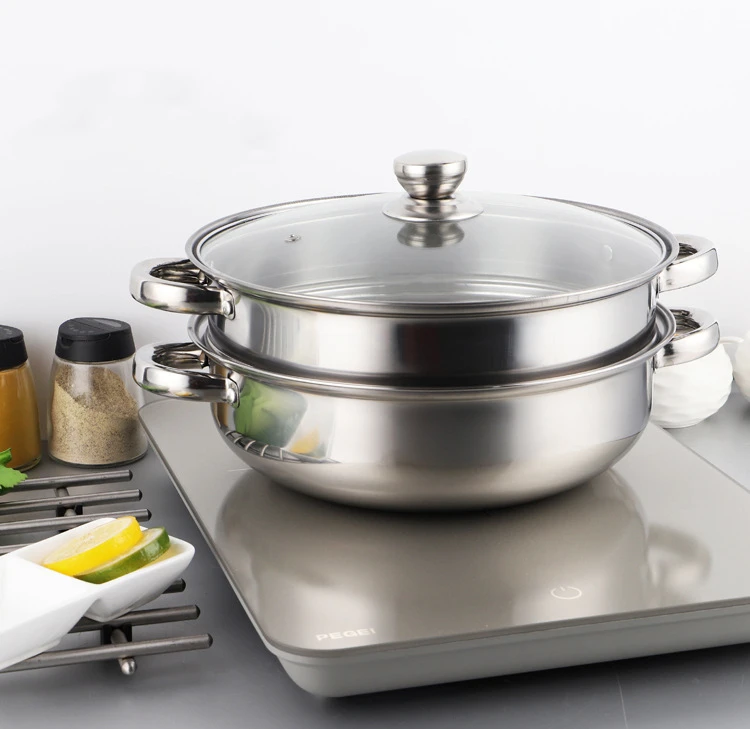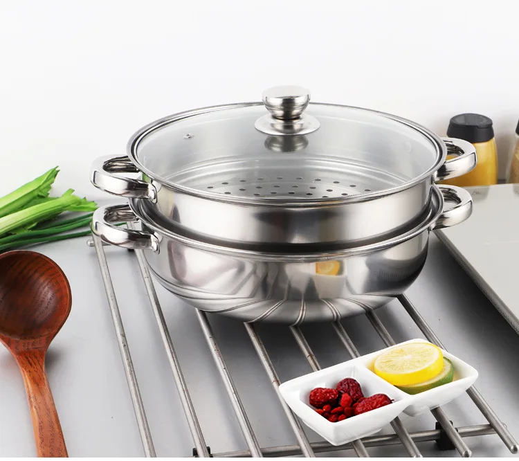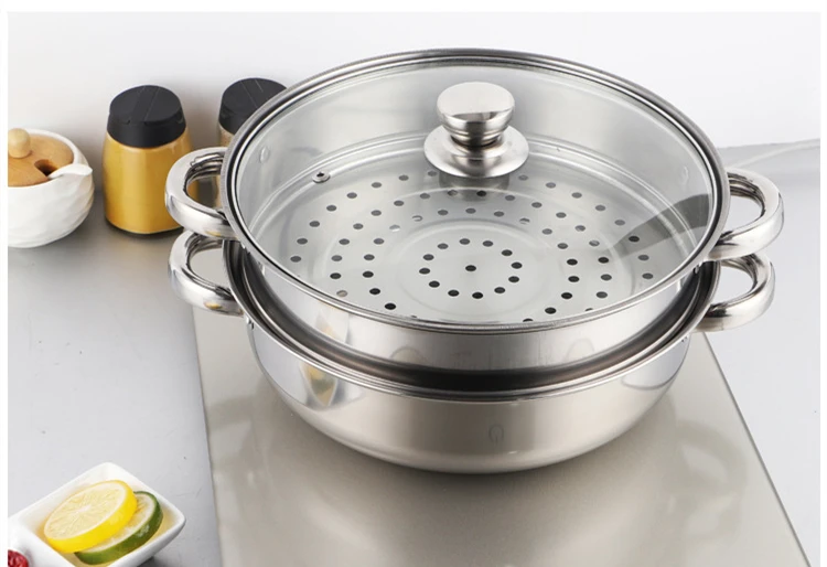 Эта Пароварка изготовлена из нержавеющей стали, а крышка-из закаленного стекла. Верхний слой вентилируется и подходит для приготовления пищи на пару. Нижний слой может парить продукты или варить суп. Два слоя можно вынуть отдельно. Подходит для индукционной плиты, галогенной плиты, электрической керамической плиты и газовой плиты.