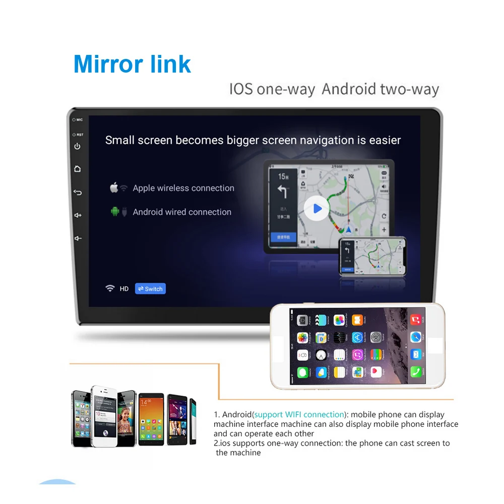 Особенности: ●HD 9 ''2.5D закаленное Стекло зеркало Авто GPS радио mp5 плеер ● Обновленная двойная система зеркальной связи: IOS/Android зеркальной связи IOS one-way:IOS поддерживает мобильный телефон с односторонней проекцией на машину Android двухсторонний: Android поддерживает мобильный телефон обратная связь, когда ● Встроенная gps-навигация: пользователи могут покупать напрямую из play store для автономной навигации. С подключением к Wi-Fi, Google Maps может использоваться идеально, вы можете пойти куда угодно и никогда не потеряться снова. ● Встроенный WIFI: подключение к WIFI, и вы найдете новый мир, самый удобный-это онлайн-карта. ● Камера заднего вида: необходимо выбрать камеру, автомобиль подключен к обратной передаче для автоматического переключения (требуется дополнительно) ● Управление рулевым колесом: через него вы можете управлять функциями, которые вам нужны, с помощью рулевого колеса, более удобно ● Встроенный Bluetooth с A2DP/Hands Free/Телефонная книга: Bluetooth hands-free Звонки, Bluetooth музыкальный плеер, Автозагрузка телефонных книг ● Запись вождения: вы можете выбрать регистратор, и автомобиль имеет воспроизведение, доказательства могут быть сохранены ● Вход с двойным usb-адаптером ● Поддержка файлового менеджера: поддержка загрузки, установки и удаления более тысячи приложений android ● Поддержка нескольких языков: поддержка языков, до 40 национальных языков ● Вы можете наслаждаться музыкой с вашего мобильного телефона без каких-либо кабелей, а также поддержка USB connetion. ●Fm/AM радио: он-лайн музыки можно передачи музыки на стерео FM, чтобы насладиться оригинальный автомобильный стерео звук, со светодиодной подсветкой из 30 предустановленных станций ● Настройка времени: вы можете использовать сеть или GPS, чтобы автоматически открыть дату и время, или вы можете настроить его вручную. Примечание: передатчик, мы продаем только FM, если вам нужны AM просьа связаться с продавцом, спасибо.