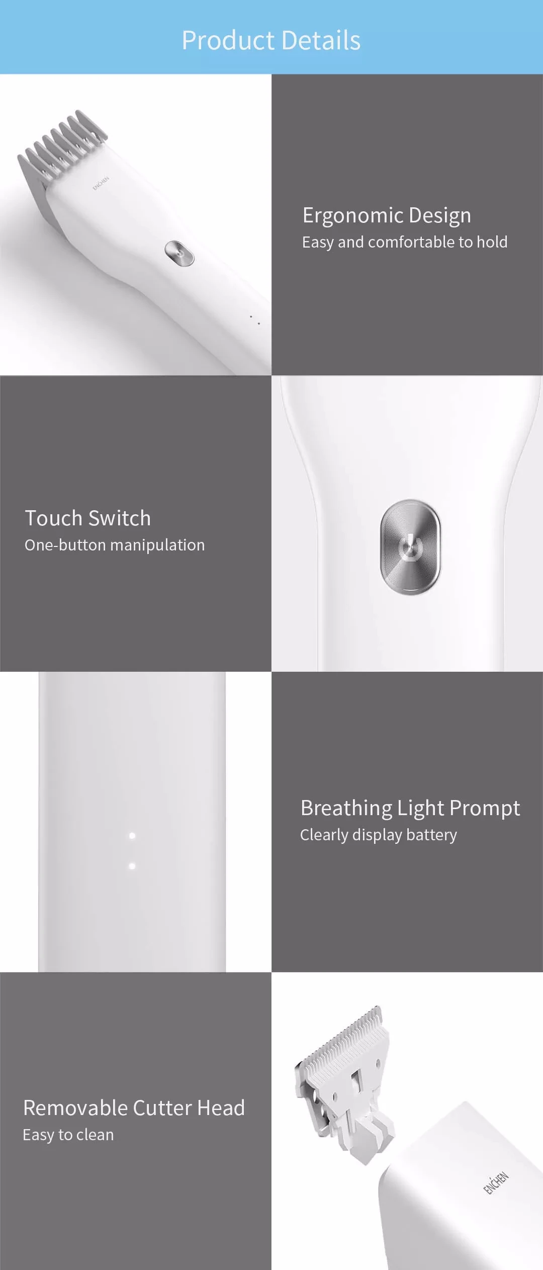 ● Ergonomic Design Easy and comfortable to hold ● Touch Switch One-button manipulation ● Breathing Light Prompt Clearly display battery ● Removable Cutter Head Easy to clean