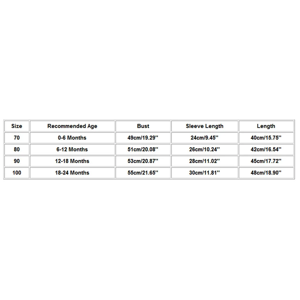 Размеры Рекомендуемый возраст Обхват груди Рукав Длина Длина 70 Для детей от 0 до 6 месяцев 49 см/19,29'' 24 см/9,45'' 40 см/15,75'' 80 6-12 месяцев 51 см/20,08'' 26 см/10,24'' 42 см/16,54'' 90 12-18 месяцев 53 см/20,87'' 28 см/11,02'' 45 см/17,72'' 100 18-24 месяцев 55 см/21,65'' 30 см/11,81'' 48 см/18,90''