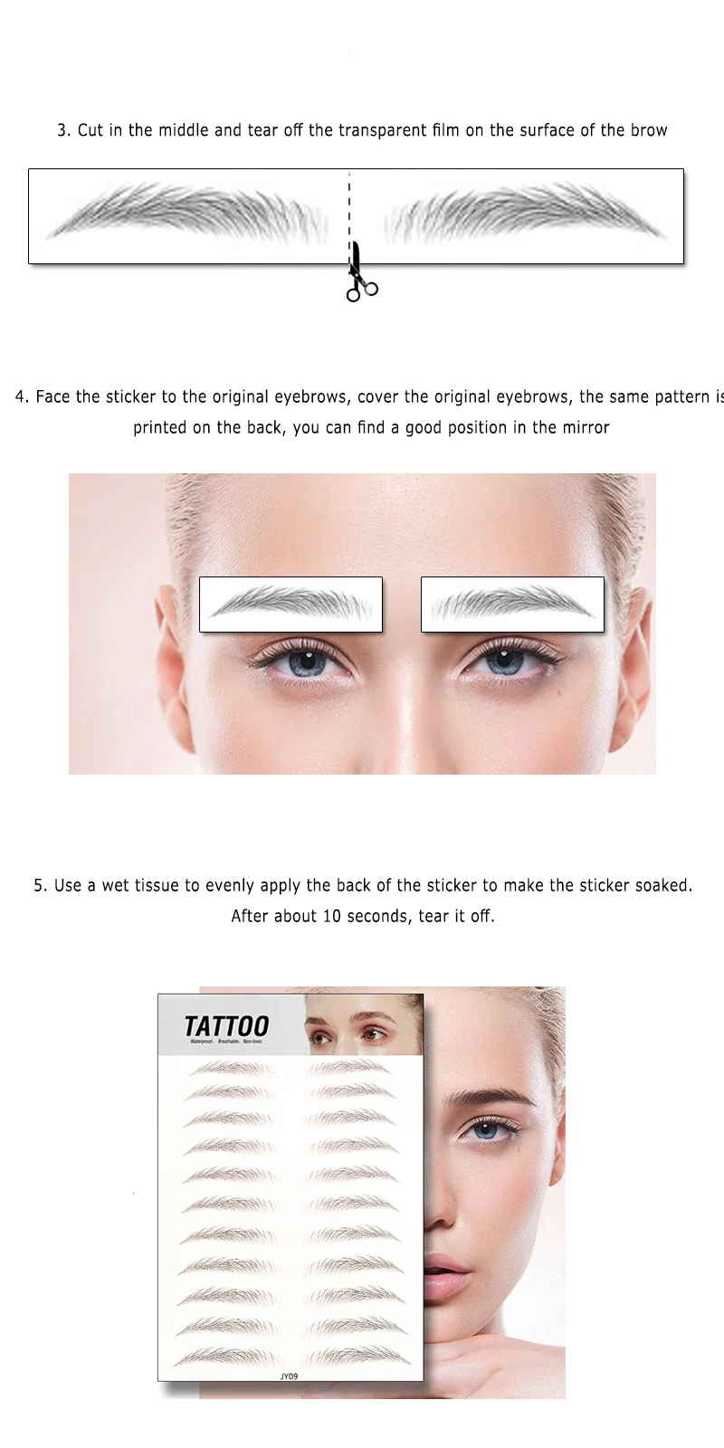 1. Cut out a pair of eyebrow stickers first, try to cut on the edge of the eyebrow as much as possible, don't leave too much blank space.