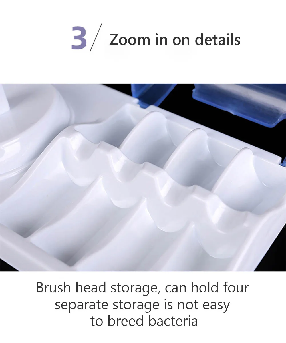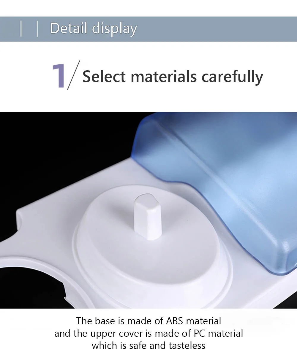 1. Экологически чистый и твердый полипропиленовый материал без вреда для человеческого тела 2. Специальная конструкция отверстия для очистки и предотвращения размножения микроорганизма 3. Легко закрываются и открываются, защищают зубную щетку от царапин 4. Подходит для большинства электрических зубных щеток Oral B (пожалуйста, подтвердите подходящие модели)