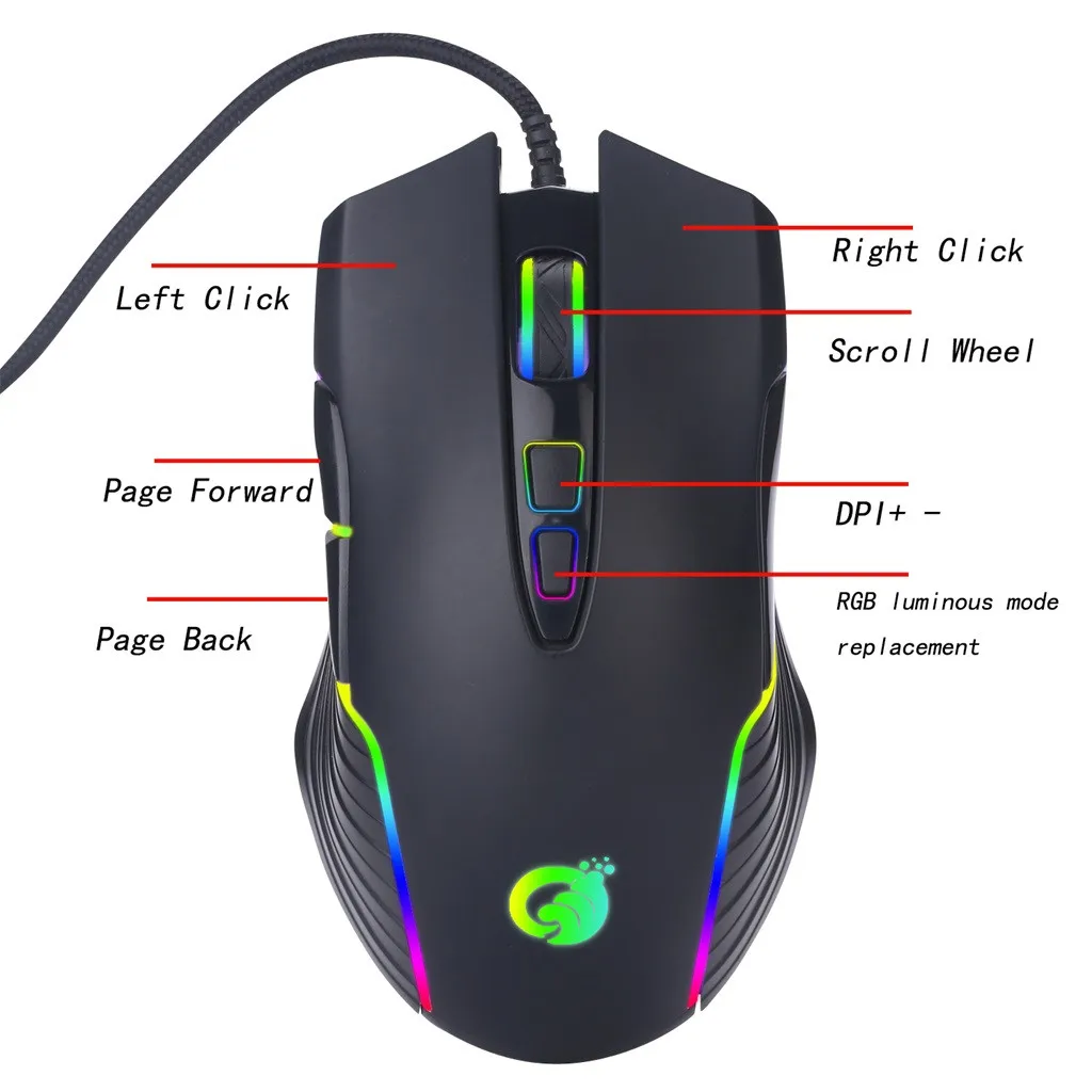 Кнопка, правая кнопка, кнопка прокрутки, страница вверх, страница вниз, DPI, RGB светильник