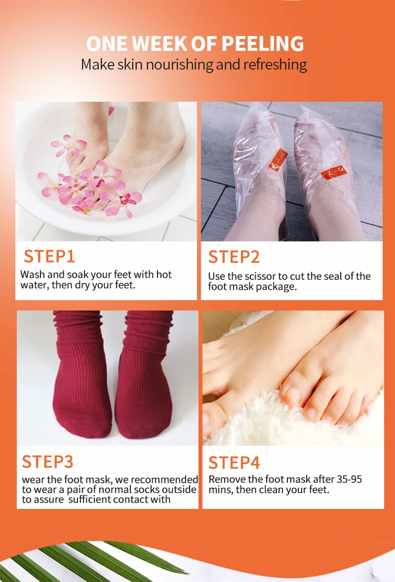 1. Вымойте и Замочите ноги горячей водой, а затем высушите ноги. 2. Используйте ножницы, чтобы вырезать Уплотнение Маски для ног посылка. 3. Носите маску для ног, мы рекомендуем носить пару нормальных носков снаружи, чтобы обеспечить достаточный контакт с эссенцией. 4. Снимите маску для ног через 35-95 минут, затем очистите ноги. 5. Большинство людей начинают очищать омертвевшую кожу после 48 часов использования, но из-за различных типов кожи кому-то может потребоваться 2-3 пары, пожалуйста, используйте маску для ног снова 48 часов позже. 6. Не используйте маску, если у вас есть активный порез или ран. 7. Мы предлагаем вам замочить ноги горячей водой после 48 часов использования.