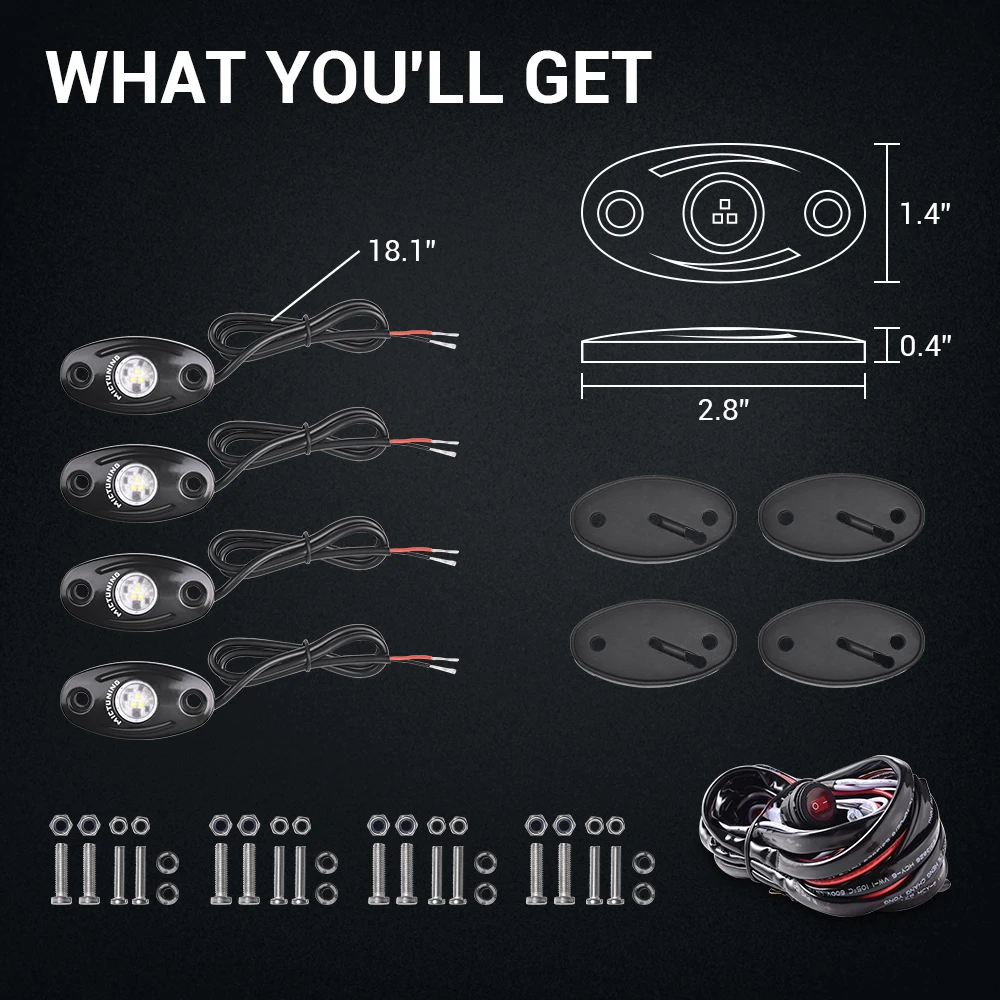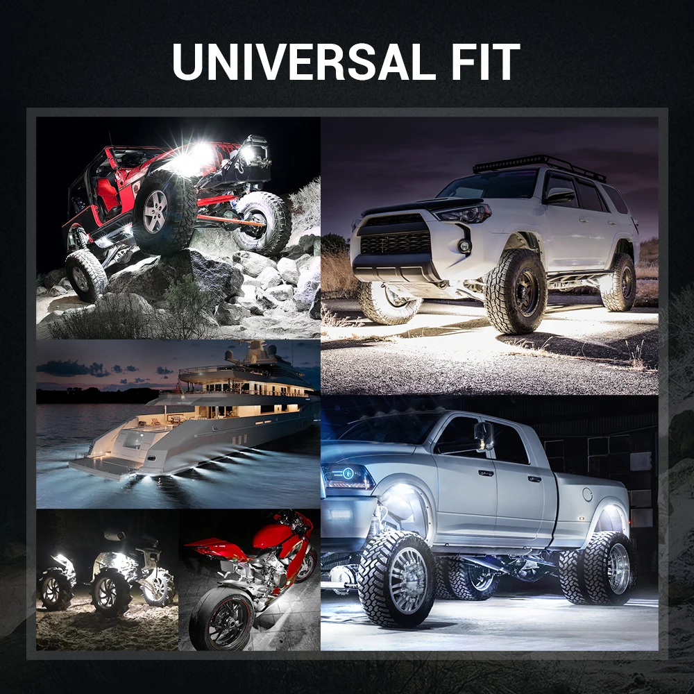 Параметры: Напряжение: 12-24 В Светодиодный, Количество: 3 чипа каждый под Мощность: 9 Вт (3 Вт каждый чип) Линзы: поликарбонат Водонепроницаемость: IP68 Светодиодный Цвет: белый Световой поток: 3000LM 1. Чистый белый светильник-чип высшего качества для каждого светодиодный светильник-камень, более яркий и стабильный, улучшенный и настраиваемый ночной режим вождения 2. Гибкий монтаж-стиль «сделай сам», может быть установлен где угодно. Идеально подходит для салона автомобиля и т. Д. 3. Долговечность-IP68 водонепроницаемый, ударопрочный, пылезащитный. Усиленная линза из поликарбоната, долговечная, без пожелтения линз. Литой алюминиевый корпус, быстрый рассеивания тепла, До 50000 часов продолжительности срока службы 4. Универсальное крепление-подходит для детей возрастом от 12-24V автомобиль, грузовик, внедорожник, лодка, внедорожник, UTV, ATV, и т. д. Применение их под вашим автомобилем или в качестве внутренней светильник, бездорожье светильник, задний светильник, купольный светильник, неоновый светильник светодиодный, замена 5. То, что вы получите-посылка включает в себя светодиодный фонарь Rock 4 Pods, бонусную проводку. Рекомендуется Профессиональная установка, пожалуйста, найдите профессионального человека для подключения светильник Светодиодный чип MICTUNING Rock Lights 4 Pods выводит чистый белый, чтобы улучшить и настроить свой ночной режим вождения. Литой алюминиевый корпус с усиленным стеклом и линзой из поликарбоната, линза не будет желтоватой для длительного использования. Полностью водонепроницаемый, ударопрочный, антикоррозионный, без проблем работает под дождем и в суровых условиях. Стиль «сделай сам», может быть установлен где угодно. Небьющееся резиновое основание для поверхностного монтажа или изогнутого крепления. Подходит для автомобилей, грузовиков, внедорожников, прицепов, буровых установок, лодок, спортивных велосипедов, круизов, туров, Jeep, ATV, UTV, Golf cart и т. д. Используйте их под вашим автомобилем или как внутренний светильник, светильник дальнего света, задний светильник, купольный светильник, неоновый светильник светодиодный на замену, строительный светильник s, светильник вилочного подъемника, снежный светильник s и т. Д.