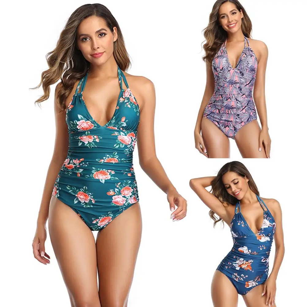 Женский летний купальник с открытой спиной и цветочным принтом, цельный пляжный купальник