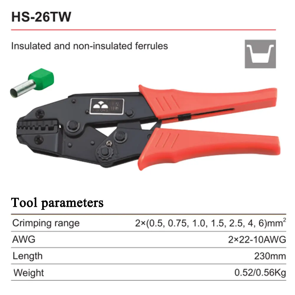 1. Упаковка: HS-26TW + 350 шт. 2. HS-26TW плоскогубцы * 1 3. 350 шт. Двойные наконечники (Высококачественные клеммы)