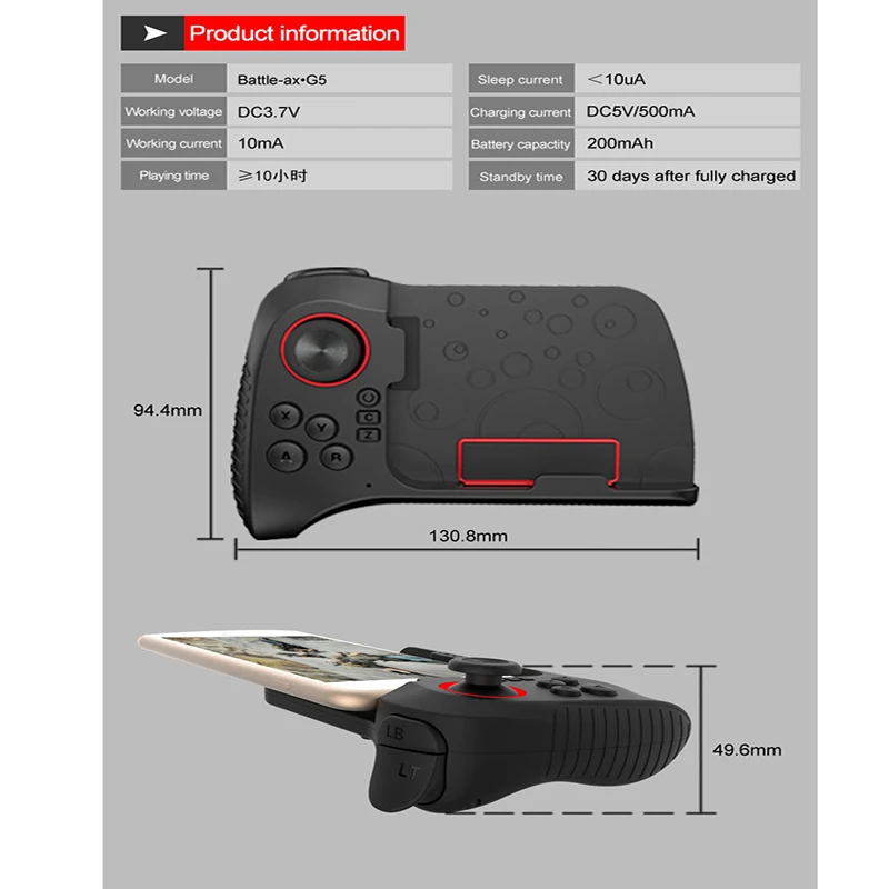Название продукта: Gamepad Тип: bluetooth-геймпад с одной рукой Модель: G5 Цвет: черный Bluetooth4.0 подключение: Да Режим управления: кнопка + джойстик Ток в режиме ожидания: <10uA Рабочий ток: <10 мА Рабочая Напряжение: DC3.7V Емкость аккумулятора: 200 мАч Зарядное напряжение/ток: DC5V/500mA Время непрерывного воспроизведения: более 20 ч Время работы: более 40 дней Применимая Платформа: для Android4.0 +/iOS11.0 +/PC/PS3 Совместимость с: телефоном или столом 4-10 дюймов и выше Размер изделия: около 130,8*94,4*49,6 мм