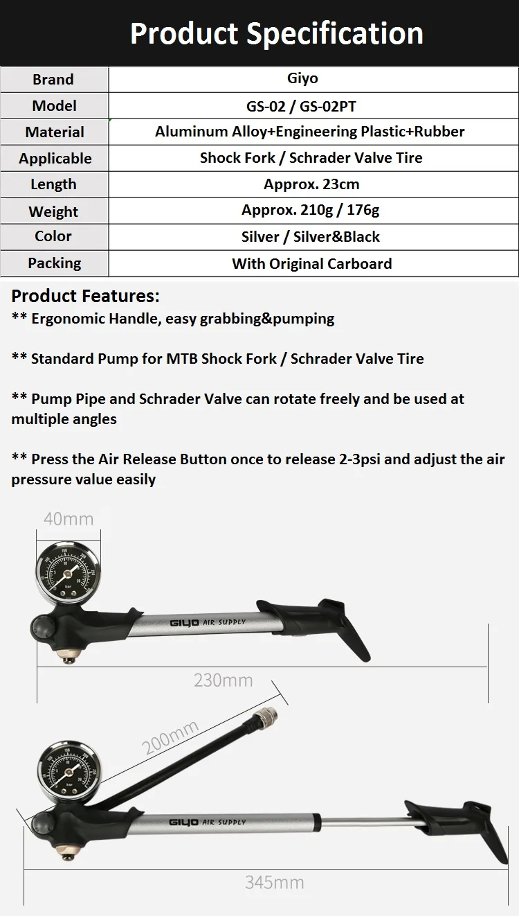 GS-02* С манометром* Макс. 300psi* Прибл. 210 г* Подходит для клапана Schrader* Прибл. Длина 233 мм* С кнопкой спуска воздуха* Корпус насоса из алюминиевого сплава* Головка насоса из алюминиевого сплаваGS-02PT* С манометром* Макс. 300psi* Прибл. 176 г* Подходит для клапана Schrader* Прибл. Длина 233 мм* С кнопкой спуска воздуха* Корпус насоса из алюминиевого сплава* Инженерная пластиковая головка насоса** Эргономичная ручка, легко захватывает и накачивает** Стандартный насос для MTB амортизирующей вилки/Schrader Клапан шины** Труба насоса и клапан Schrader могут свободно вращаться и использоваться под разными углами** Нажмите кнопку спуска воздуха один раз, чтобы отпустить 2-3psi и легко отрегулировать значение Air Press ure*** Разница между GS-02 и GS-02PT-это материал головки насоса, как указано выше!GS-02D (черный) / GS-02D (серебристый)* С манометром* Макс. 300psi* Прибл. 234 г* Подходит для клапана Schrader* Прибл. Длина 260 мм* С кнопкой спуска воздуха* Корпус насоса из алюминиевого сплаваGS-02DT (черный)* С манометром* Макс. 300psi* Прибл. 234 г* Подходит для клапана Schrader (расширенный клапан)* Прибл. Длина 260 мм* С кнопкой спуска воздуха* Корпус насоса из алюминиевого сплава** Модернизированное второе поколение (по сравнению с GS-02D)Примечание: 1 шт. Бесплатный адаптер передачи данных будет доступен для каждого насоса, цвет будет случайный.GS-41E (черный)