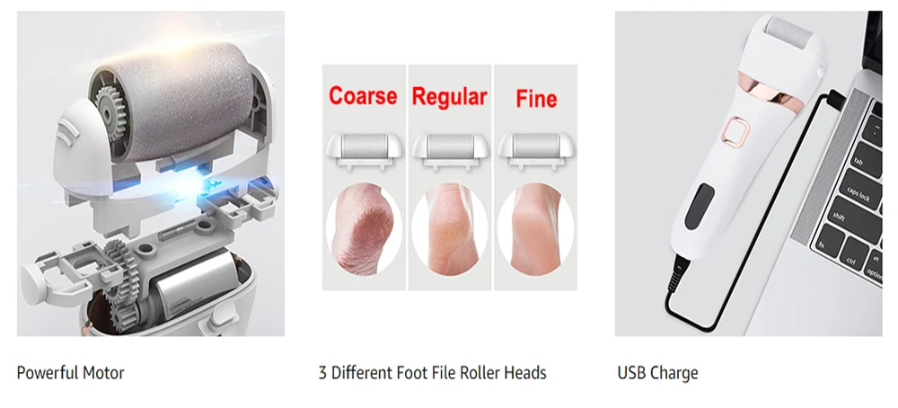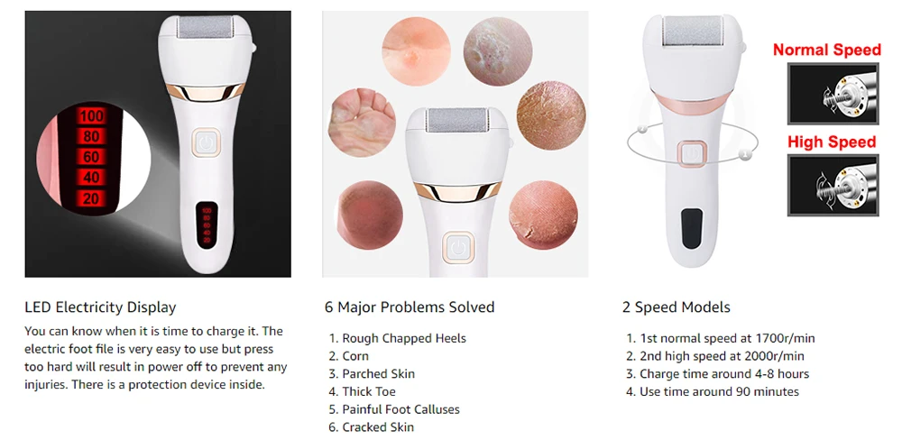 1.1700x/мин и 2000x/мин; Используйте средство для ухода за ногами, которое позволяет быстро и эффективно удалять толстые, грубые, сухие кожи и треснувшие каблуки за считанные минуты. 2. Набор электронных педикюрных пилок для ног включает грубую, среднюю и мелкую роликовую головку. Вы можете выбрать один из них в зависимости от шероховатости кожи. 3,5 уровень ЖК-дисплей Мощность Дисплей 4.IPX7 водонепроницаемый, простой дизайн без винтов и пыли 5. С перезаряжаемой емкостью аккумулятора 1200ма, зарядка один раз, многократное использование.