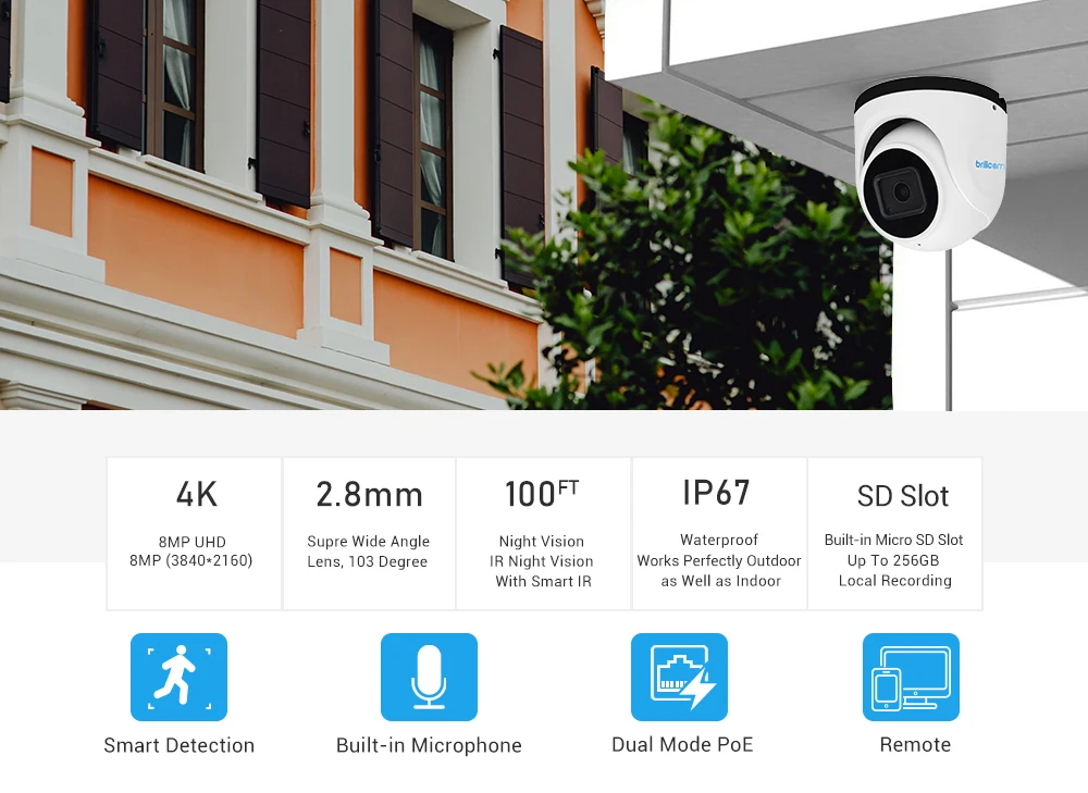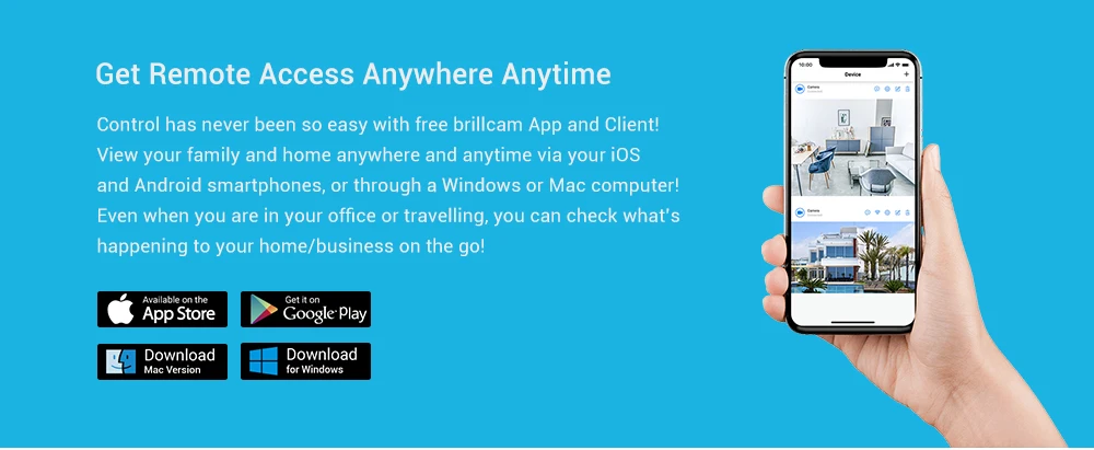 Получайте уведомления о движении и просматривайте кадры с помощью смартфона с приложением Brillcam. Воспроизведение и запись профессионально на ПК или Mac с помощью Brillcam бесплатного программного обеспечения Smart Client или Blue Iris и т. Д. Вечерние программы 3rd. Работает с максимальной картой MicroSd класса-10 SDHX 256 ГБ, Brillcam/HIKVISION/Dahua NVRs с подключением и воспроизведением, синхронизацией и QNAP NAS, FTP, И веб-интерфейс флэш-памяти для ПК (Chrome/Firefox/Safari/Edge) или IE с установкой расширения Brillcam.