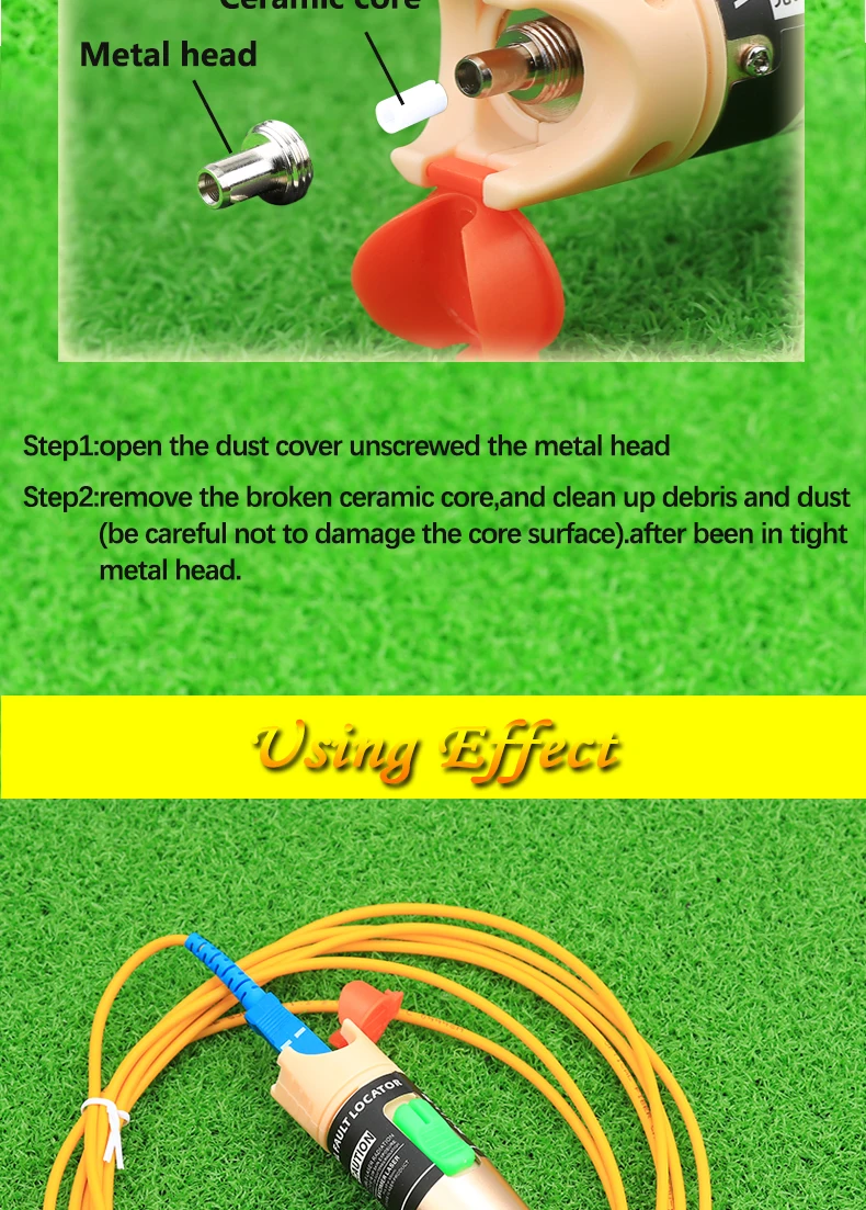 Параметры: Выходная мощность: 1 мВт/10 мВт/20 МВт/30 мВт Длина волны: 650 нм ± 10 нм Разъем: 2,5 мм Универсальный коммуникатор Размер упаковки: 210*73*30 мм Вес: 120 г Источник питания: AA * 2 щелочные батареи (не входят в комплект) Рабочая температура: 0 ℃ ~ 60 ℃ Температура хранения: -20 ℃ ~ 70 ℃ Материал: металл Размер: 175*26*26 мм Вес: 160 г Особенности: 1. Легко проверить неисправности волокна с визуальный светильник, портативный и прочный, пыленепроницаемый дизайн держать волокна Разъемы чистой 2. Практичный дизайн и отличная функция-маленький размер и легкий, он портативный и легкий для полевого теста с несколькими функциями 3. Простая и точная идентификация-он может легко и точно обнаруживать и находить разрывы волокна, плохое соединение, изгиб или растрескивание. 4,2 Гц Линт или непрерывный выход 5. Визуальный дефектоскоп используется для измерения в Одномодовых или многомодовых волокнах. Область применения: Телекоммуникации и техническое обслуживание CATV и техническое обслуживание Кабелей Системы Другие волоконно-оптические проекты