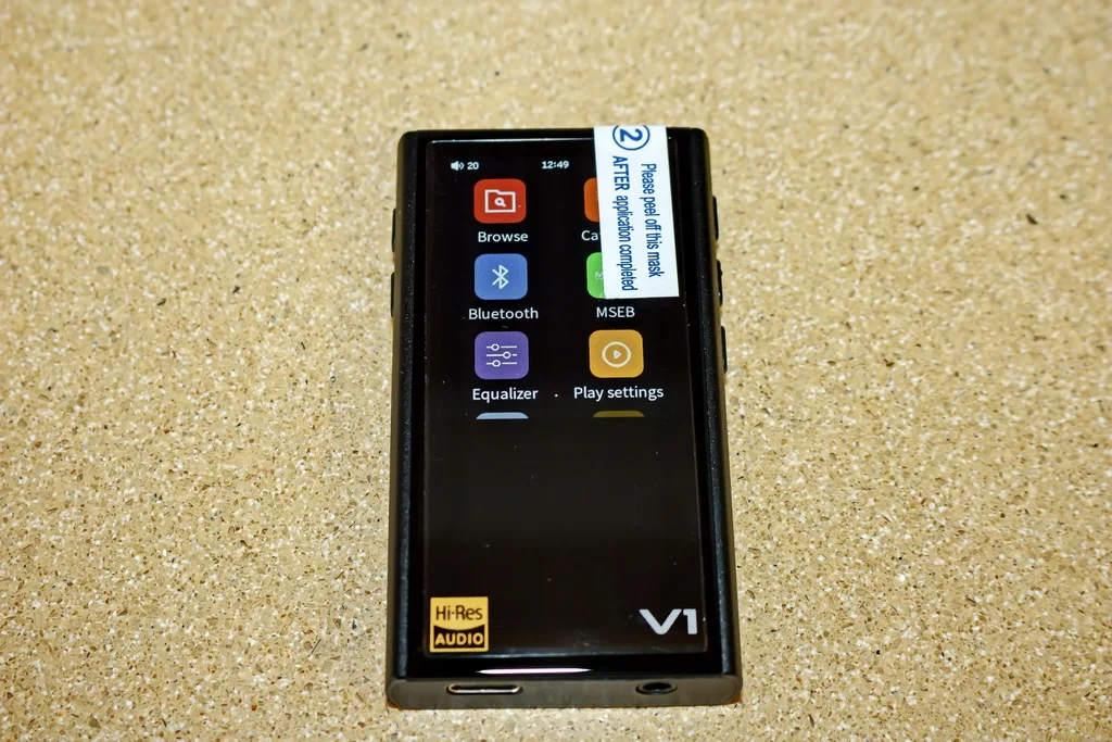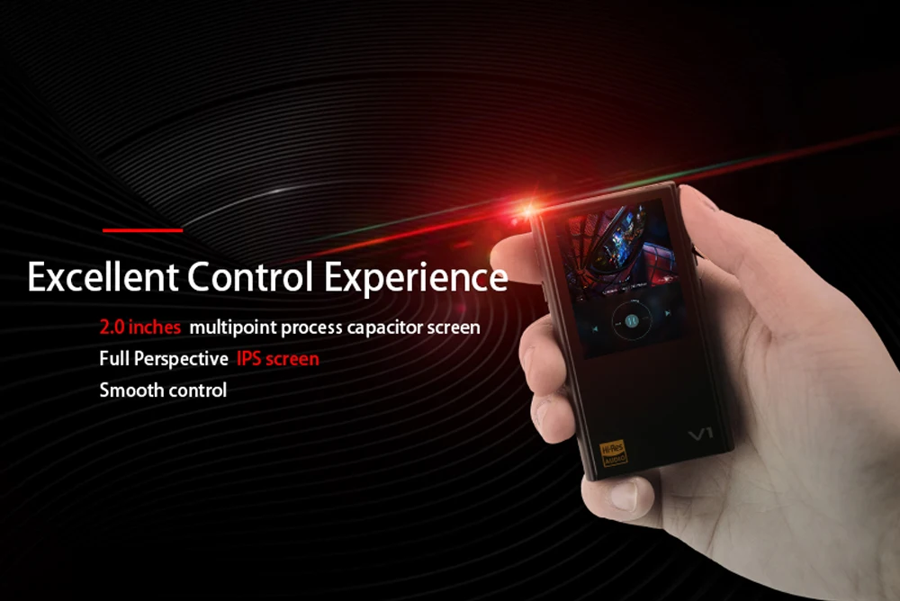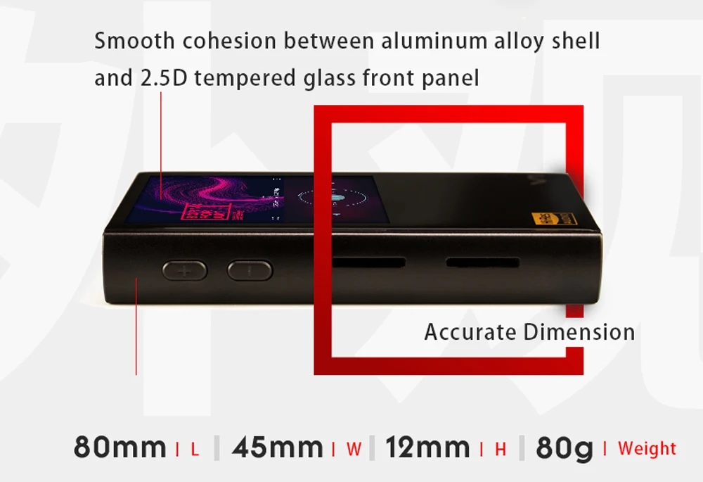 Вариации V1-A. HiFi плеер. Гладкая сплоченность между корпусом из алюминиевого сплава и передней панелью из закаленного стекла 2.5D. Точный размер: 80 мм | L , 45 мм | w , 12 мм | H , 80 г | Вес