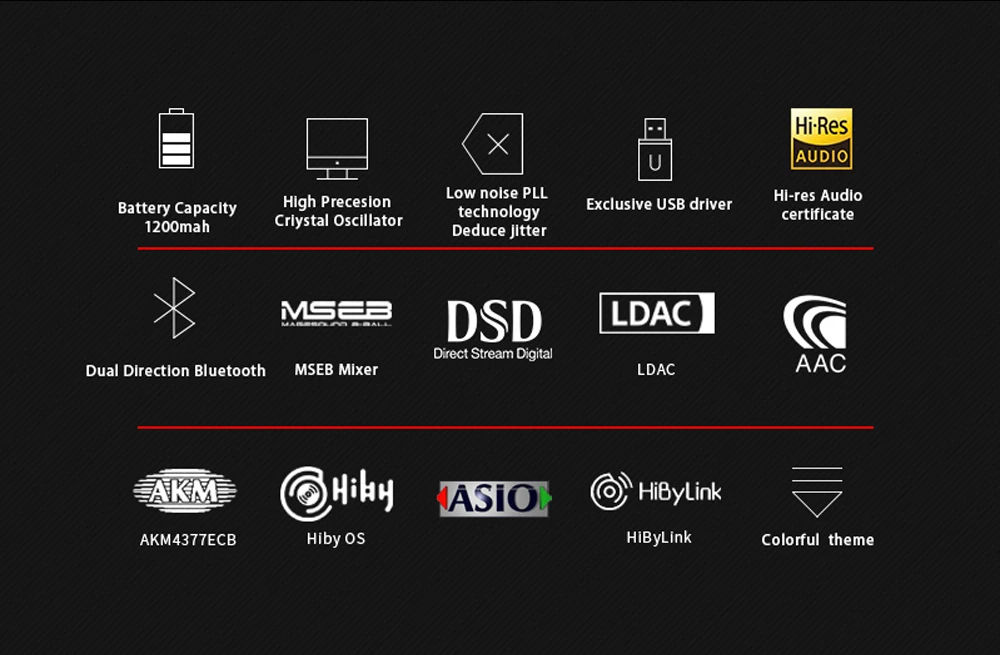 Низкий уровень шума PLL технология Deduce джиттер, эксклюзивный драйвер USB. HI-res аудио сертификат, миксер MSEB, прямой поток цифровой. LDAC, AAC, AKM4377ECB, Hiby OS, ASIO, HiByLink, красочная тема. Изысканные компоненты, эксклюзивный MCU, только для отличного качества звука Sony Hi-Res сертификат, высоко воспроизводит оригинальную музыку, Hi-Res, аудио. Цифровой миксер ---- MSEB, сделает вас отличным тюнером. Базовая станция Bluetooth, двойное направление, не является ни передатчиком Bluetooth, ни декодером Bluetooth, с высоким разрешением.