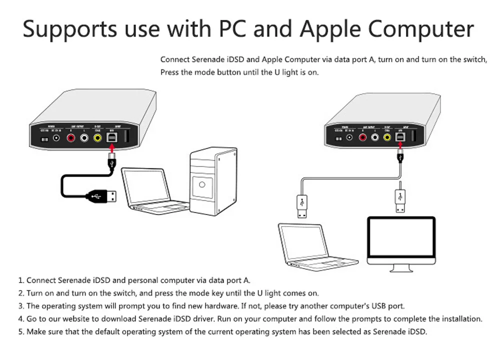 1. Подключите Serenade iDSD и персональный компьютер через порт передачи данных A. 2. Включите и включите переключатель и нажмите клавишу mode до тех пор, пока светильник U не загорится. 3. Операционная система предложит вам найти новое оборудование. Если нет, попробуйте другой usb-порт компьютера. 4. Перейдите на наш веб-сайт для загрузки драйвера Serenade iDSD. Запуск на вашем компьютере и следуйте инструкциям для завершения установки. 5. Убедитесь, что операционная система по умолчанию текущей операционной системы была выбрана как Serenade iDSD.