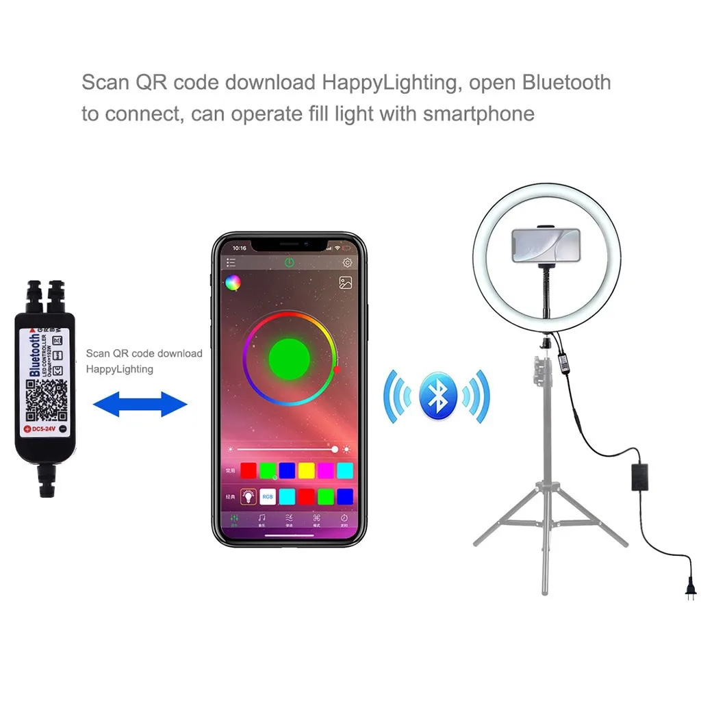 Скачайте happylighting, откройте для подключения, можете Светодиодный светильник со смартфоном. Изменение цветовой температуры RGB, цвет RGB Кольцевой светильник, съемка всего за одну секунду. Светильник может изменить цвет с помощью музыкиПродукт включает в себя