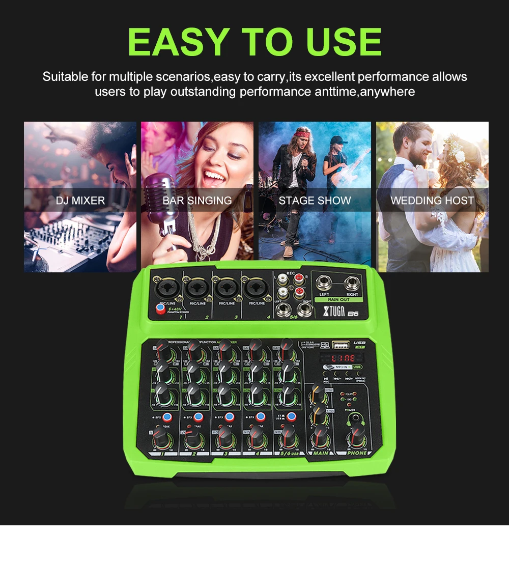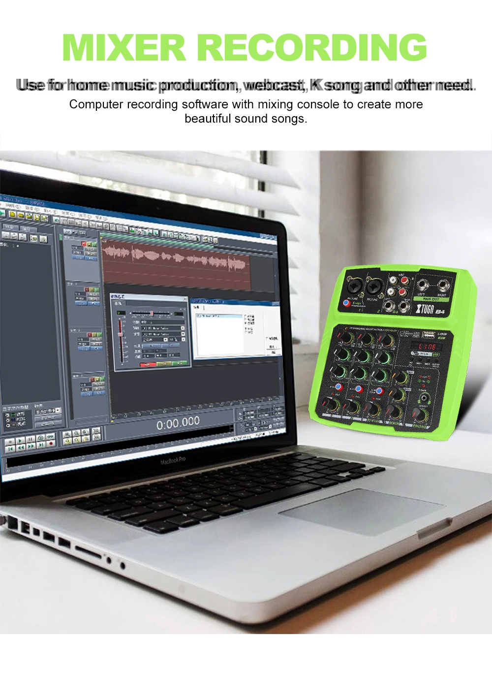 5.Это многофункциональный 4-канальный мини микшерный пульт с звуковая карта. Он может удовлетворить пользователей многие требования, такие, как домашний музыкальный производство, прямые трансляции, караоке крышка и так далее.