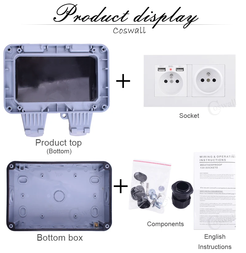Coswall IP66 Водонепроницаемая наружная настенная розетка с двойным французским стандартом 16А с двойным usb-портом для зарядки 2.1A