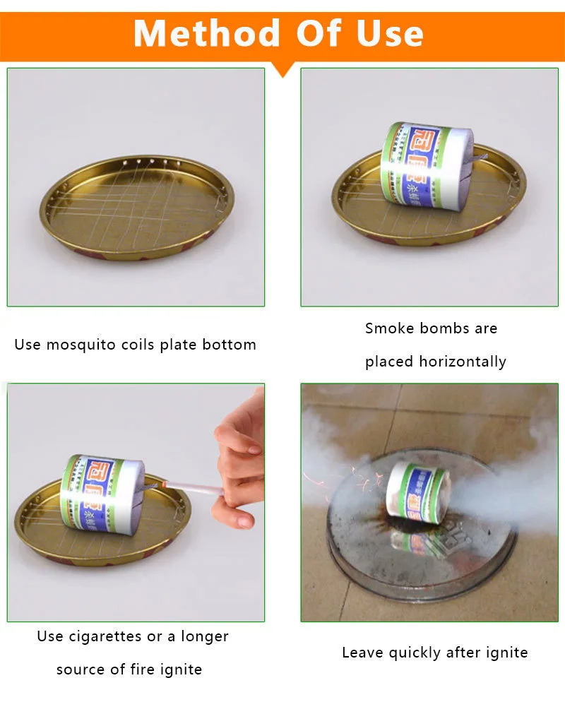 3. Откройте крышку аэрозоля и поместите дым на негорючие. Воспламените предохранитель для создания дыма. После использования люди и домашние животные немедленно выходят из комнаты.
