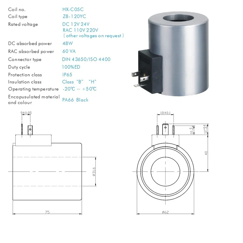 Гидравлические направленные клапаны соленоидная катушка конструктивные характеристики 1. Магнитная цепь, инкапсулированная DMC 2. Стандартный цвет DMC белый 3. Металлические детали защищены от окисления 4. DC12V 24V RAC110V 220V для вариантов 5. Тип коннетора: DIN 43650 / ISO 4400 6. Защита IP65 и класс изоляции H/B 7. 100% рабочий цикл ED 8. Рабочая температура: -20 ~ 50 градусов 9. Сила всасывания 120N