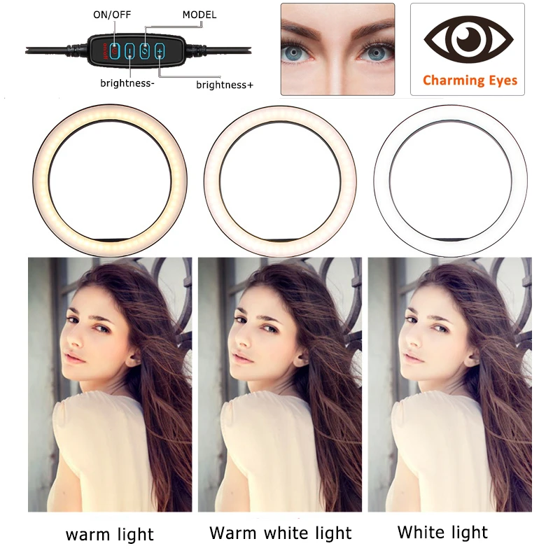 Селфи круговое кольцо с фотографией светильник круглый макияж led фото видео камера лампа студийный светильник ing с держателем телефона смартфона штатив подставка для youtube съемки tiktok 1.[Регулируемая подставка для штатива] Выдвижная от 38 см до 160 см, просто зафиксируйте его в желаемой длине для вашего предпочтительного использования, вы можете стоять на полу или просто положить на стол для вашего удобства. Штатив поддерживает все Держатели для телефона с резьбой 1/4 диаметра. Вы можете использовать его для подключения телефона отдельно для селфи 2.[Многофункциональность] 2-в-1 сочетает в себе держатель телефона и кольцевой светильник для селфи, это профессиональный инструмент для создания видео/записи в реальном времени со смартфоном или компьютером. Идеальный дополнительный светильник для макияжа, потоковой передачи в режиме реального времени, съемки Селфи, видеосъемки, онлайн-обучения, съемки темных пейзажей и т. Д. 3.[универсальный держатель телефона] совместим практически со всеми смартфонами с чехлом или без, подходит для iPhone 5 SE 5S 6 6s 6plus 6S Plus 7/87Plus/8 Plus/X/XS 5,8 ''/IPOD Touch5 / 6/XR/XS Max/для Samsung Galaxy/для Huawei/Xiaomi redmi/Moto/sony/Alcatel/LG/HTC. Поворот на 360 градусов, регулируемый обзор, может ли он быть горизонтальным, вертикальным или любым углом под солнцем. 4.[USB Power ed] работает с большинством устройств, поддерживающих usb-порт, таких как ноутбук, ПК, внешний аккумулятор, зарядное устройство USB, адаптер переменного тока и т. д. Простое управление шнуром для включения/выключения или переключения в режим освещения, который вы предпочитаете. 5.[легкий дизайн] наша кольцевая лампа очень легко разбирается и собирается, очень удобно носить с собой и путешествовать. Кольцевой светильник подробнее о продукте: Потоковый светодиодный светильник Три режима освещения (белый, теплый белый, теплый желтый) Устойчивый Штатив с противоскользящей ножкой 10 уровней яркости освещения Универсальный держатель для телефона (от 2,36 до 3,35 дюйма в ширину) Регулируемая высота стойки (от 14 до 47 дюймов) Быстрая и простая сборка, разборка Посылка включает: Пожалуйста, посмотрите на картинку