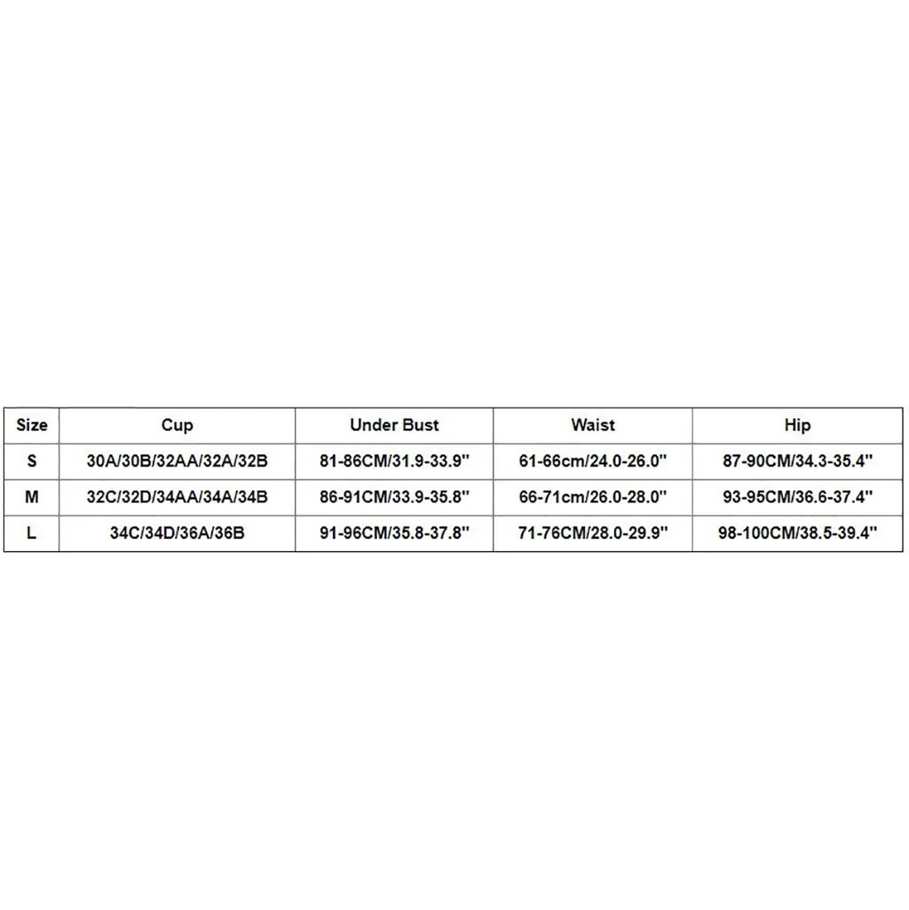 Примечание: Пожалуйста, сравните детали размеров с вашими перед покупкой! Используйте аналогичную одежду, чтобы сравнить с размеромРазмер Чашка Под грудью Талия Бедра S 30A/30B/32AA/32A/32B 81-86 см/31,9-33,9" 61-66 см/24,0-26,0" 87-90 см/34,3-35,4" М 32C/32D/34AA/34A/34B 86-91 см/33,9-35,8" 66-71 см/26,0-28,0" 93-95 см/36,6-37,4" L 34C/34D/36A/36B 91-96 см/35,8-37,8" 71-76 см/28,0-29,9" 98-100 см/38,5-39,4"