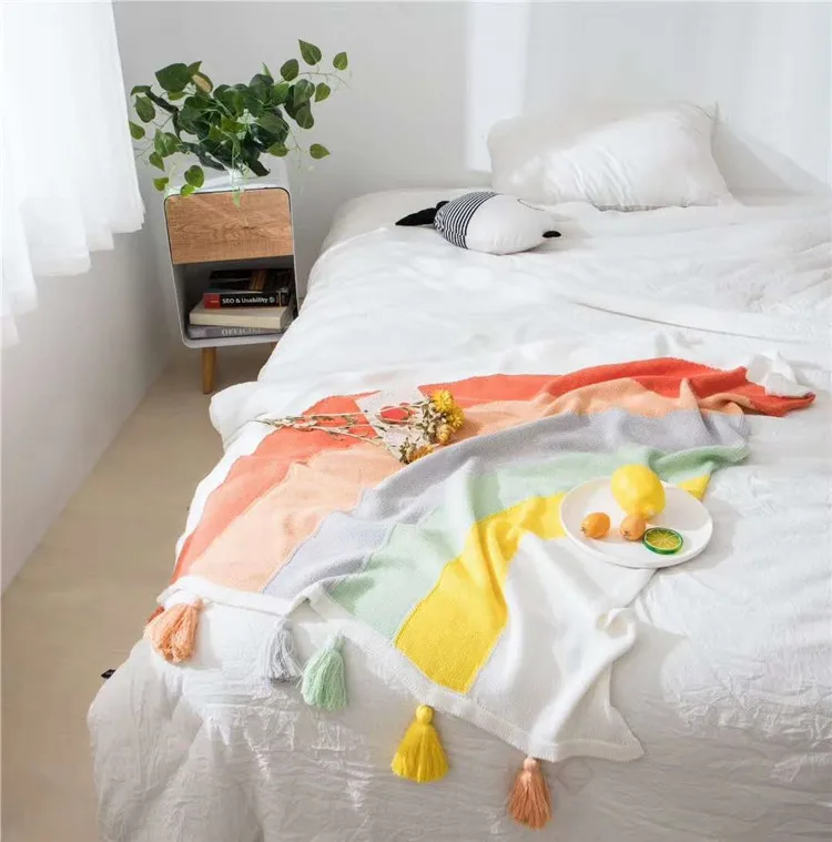 Хлопковое трикотажное одеяло с кисточками, Радужное покрывало, одеяло для малышей, детей, путешествие самолет, вязаное одеяло Материал: хлопок Размер: 70*100 см/27*39 ", 130*160 см/51*63" Цвет: как на фото Тип: Вязаное одеяло Посылка: 1 одеяло Полезные советы: из-за разницы в освещении и экране светильник может значительно отличаться от изображения. Замеры сделаны вручную, поэтому возможны отклонения на 1-5 см.