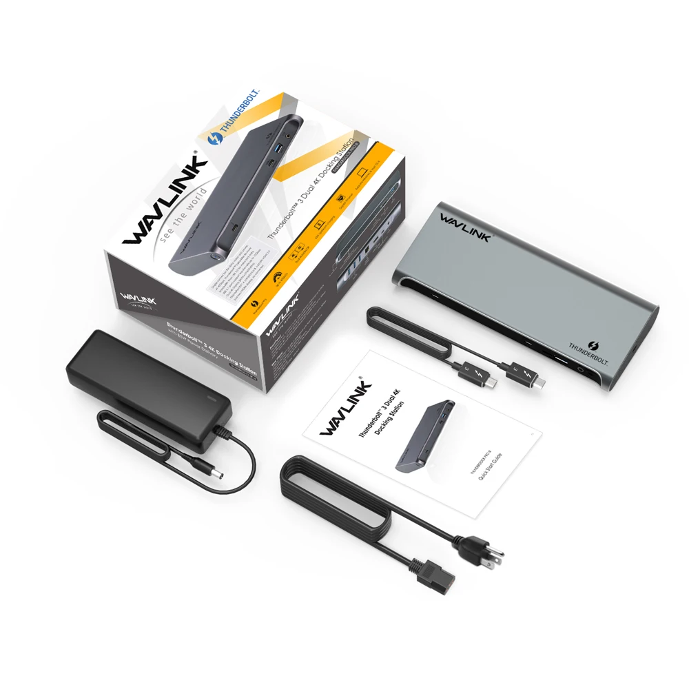 1 док-станция Thunderbolt 3 Titan USB-C Dual 4K 1x Thunderbolt 40 Гбит/с кабель 0,7 метра 1x Руководство пользователя 1x DC20V/6.5A 130W Мощность адаптер 2x Адаптер DP к HDMI