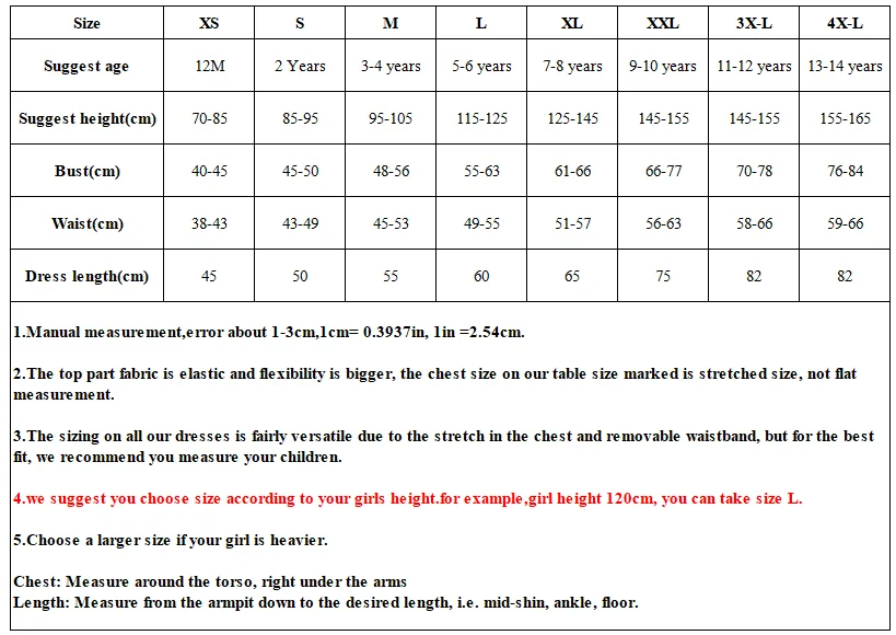 1. Мы предлагаем вам выбрать размер в соответствии с ростом вашей девочки. Например, рост девочки 120 см, вы можете выбрать размер L (5T или 6T). 2. Выберите больший размер, если ваша девочка тяжелее.