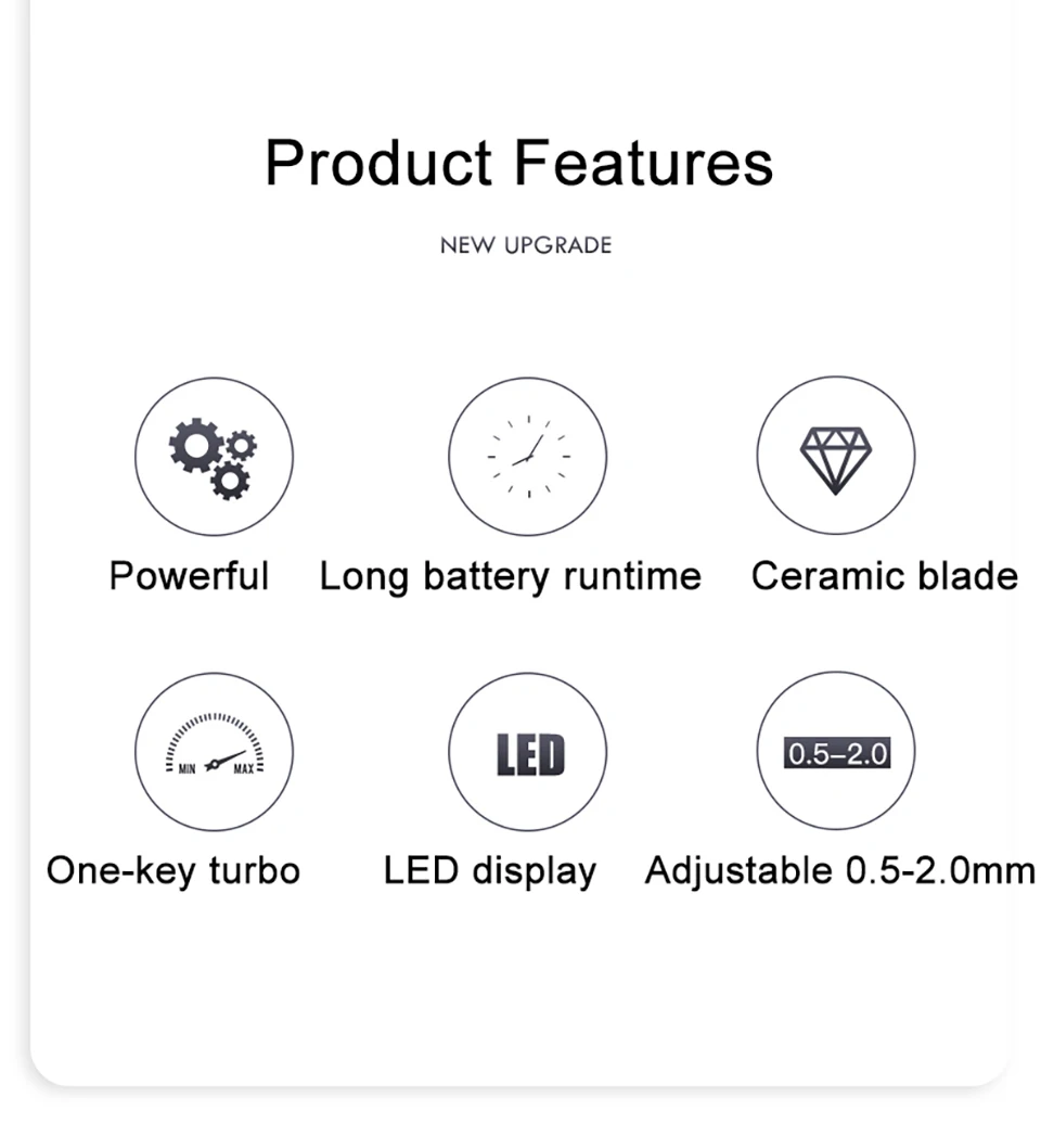 Большая емкость двойной литиевой батареи, быстрая зарядка в течение длительного времени Мытье тела для облегчения очистки Керамическая режущая головка, острый без волос Тонкая настройка головки, тонкая коррекция многошагового выбора Смазочное масло и батарея жидкие, относится к товарам, авиакомпания и таможня не принимают, мы удалили его, пожалуйста, обратите внимание! Аккумуляторы могут быть отправлены только в некоторые страны с наземным транспортом.