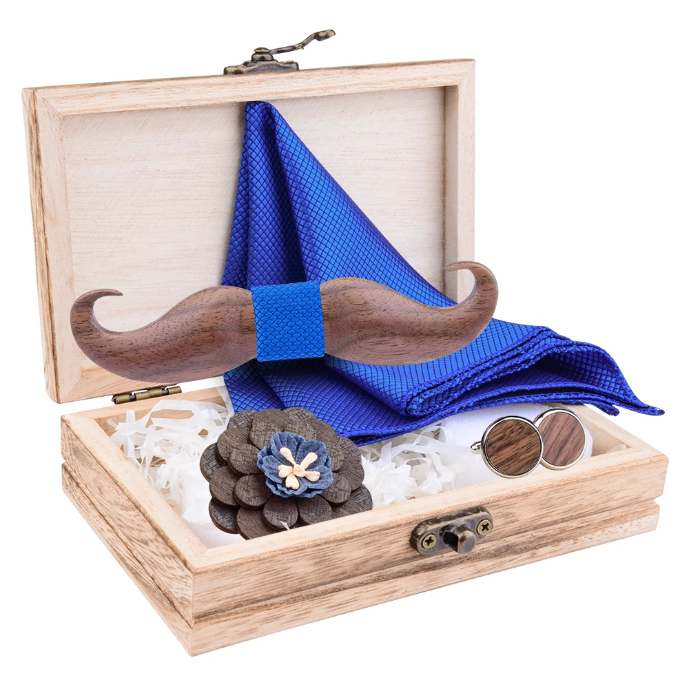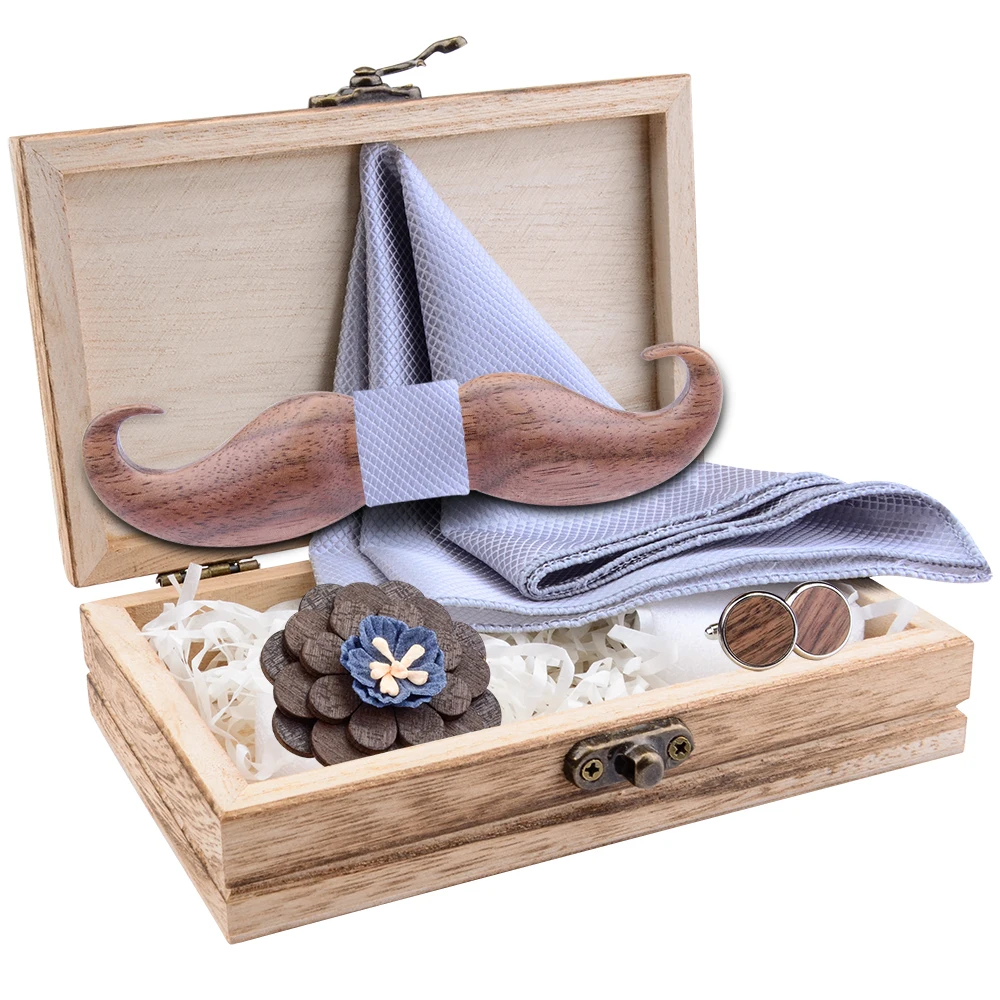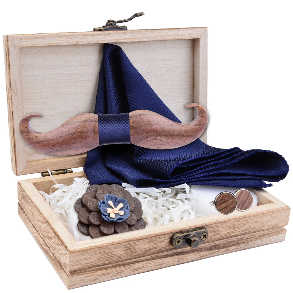 Новинка, 3D Усы, деревянный галстук-бабочка для мужчин, подарок, красный бул, плед, карман, квадратные запонки, брошь, галстук-бабочка, набор и деревянная коробка, галстуки