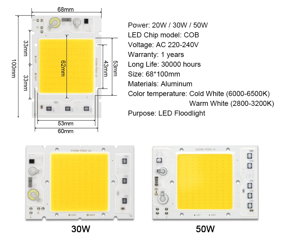 20 Вт, 30 Вт, 50 Вт, COB чип, 110 В, 220 В, светодиодная лампа, умная IC, нет необходимости, драйвер, прожектор, COB, сделай сам, освещение, холодный, теплый белый