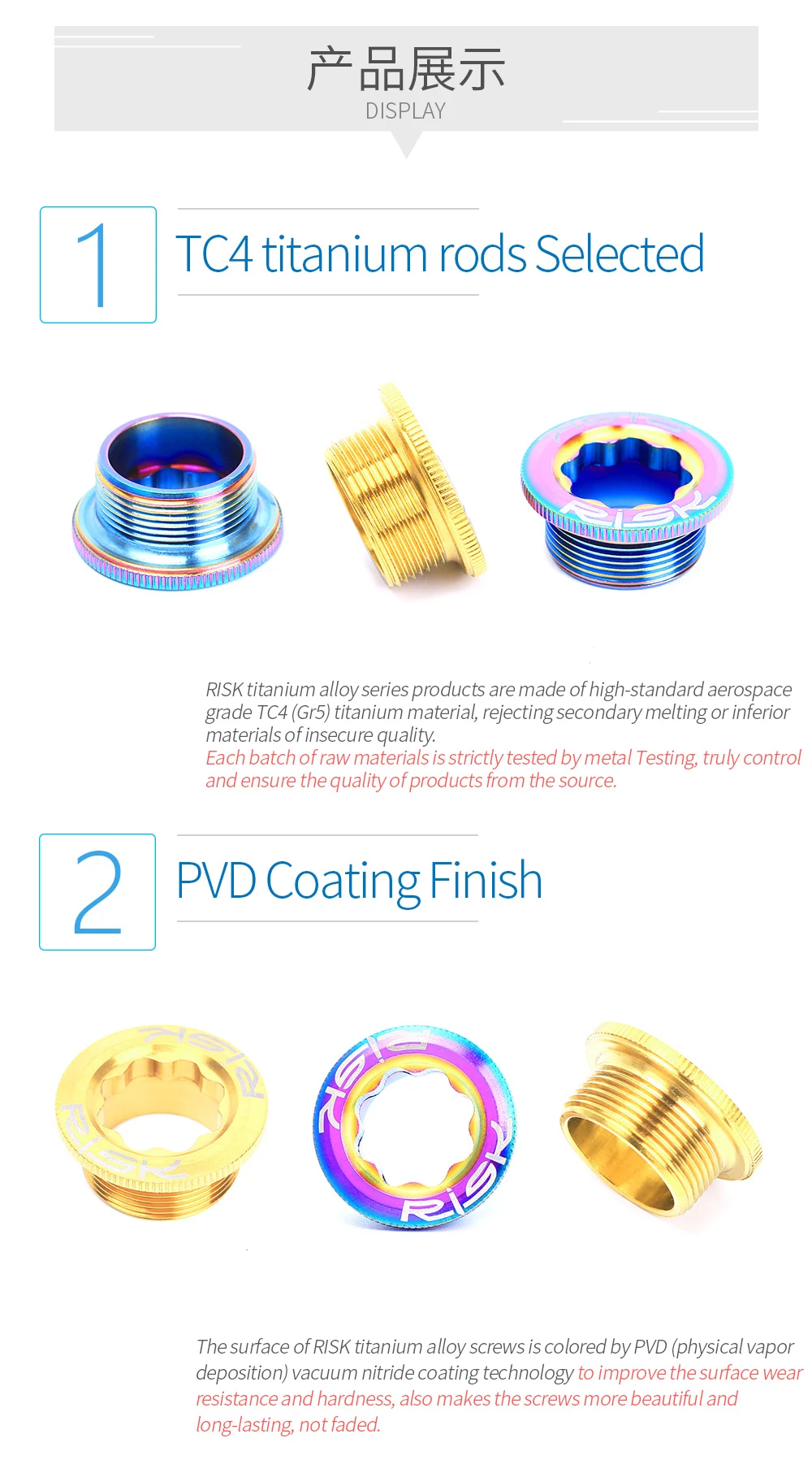 Продукты серии RISK из титанового сплава изготовлены из высокостандартного авиационного класса TC4 (Gr5) титанового материала, отвергая вторичное плавление или небезопасные материалы.