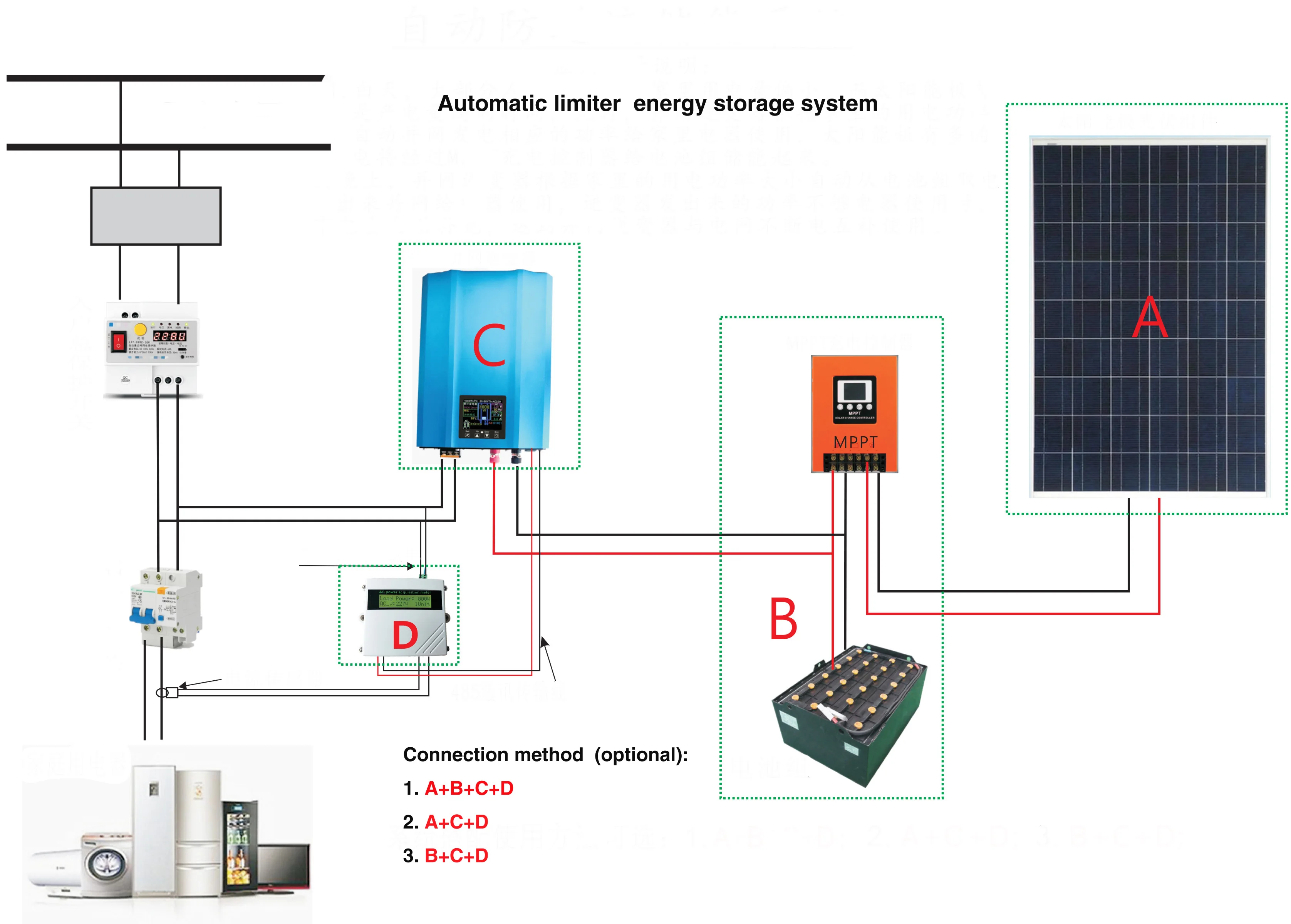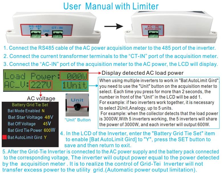 Как подключить датчик? 1. Привнесите кабель RS485 счетчика мощности переменного тока в порт 485 инвертора. 2. Подключите Соединительный терминал передаваемого датчика тока в порт коллектора "CT-IN" (no +-) 3. Подключите порт источника питания переменного тока "AC-IN" коллектора к тому же источнику питания переменного тока для нагрузки. После подключения светильник будет поднят. 4. В инверторном ЖК-дисплее введите «соединение аккумуляторной сетки», через набор {Bat AutoLimit grid} 5. Сначала Подключите инвертор к сети переменного тока, затем подключите аккумулятор, инвертор автоматически выводит ту же мощность, что и мощность, обнаруженная коллектором. Таким образом, инвертор не будет иметь избыточного электричества для отправки в сетку (т. Е. Функция автоматического ограничителя) 6. Один измерительный прибор может соединить 5 инверторов сетки