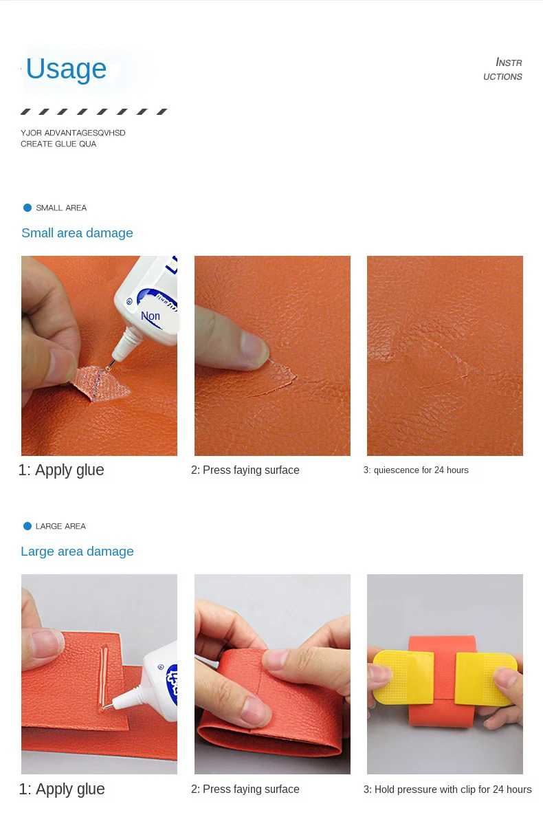 Параметры продукта:Спецификация: 30 мл/60 мл.Цвет:Прозрачный цветВремя позиционирования: 24 часаСрок годности: 1 год (2 °C-8 °C)Запах:Низкий запах.Область применения:Все виды дермы/из искусственной кожи.Информация о продукте:Этот мягкий клей для ремонта кожи имеет характеристики высокой вязкости, не повреждает поверхность кожи и небольшие отметки.1. Поверхность для ремонта жесткая и не легко трескается.2. Высокая прозрачная вязкость жидкости, не желтеет, не жесткий. Нет коррозионных ингредиентов, нет повреждений кожи.3. Не бойтесь стирки, не бойтесь разминания, сильной вязкости.4. Игла приклеена, точна и однородна. Удобно ремонтировать небольшие и узкие места.Детальный рисунок продукта: