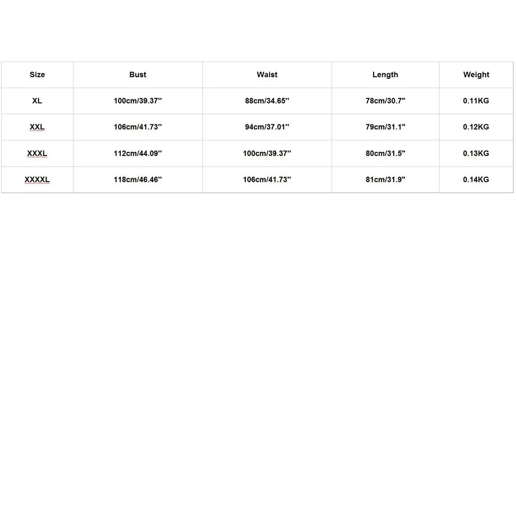 Размеры Обхват груди Обхват талии Длина Вес XL 100 см/39,37'' 88 см/34,65'' 78 см/30,7" 0,11 кг XXL 106 см/41,73'' 94 см/37,01'' 79 см/31,1" 0,12 кг XХХL 112 см/44,09'' 100 см/39,37'' 80 см/31,5" 0,13 кг XXXXL 118 см/46,46'' 106 см/41,73'' 81 см/31,9" 0,14 кг