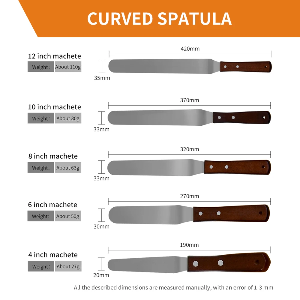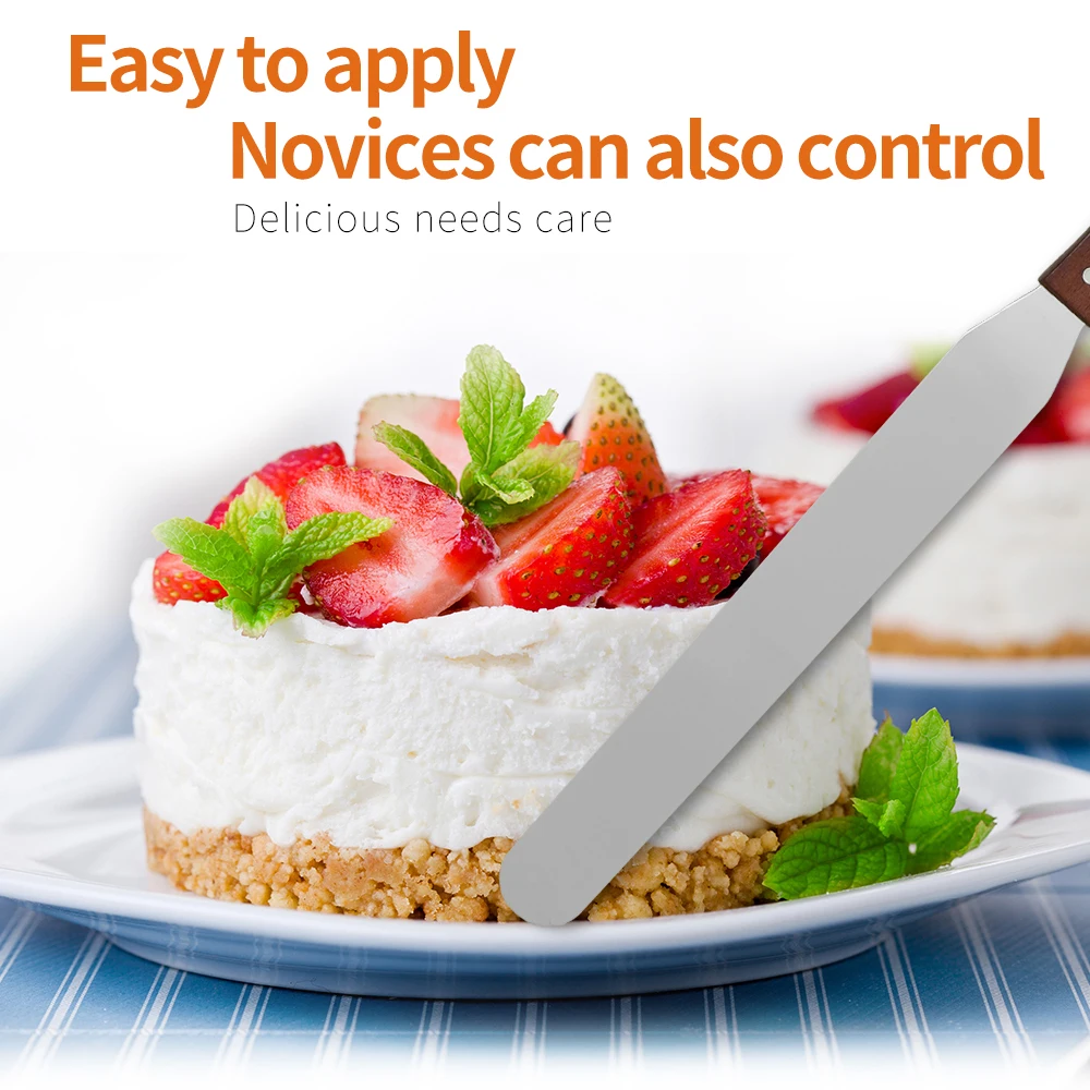Наименование товара: шпатель для торта Материал: нержавеющая сталь + деревянная ручка Размер: 4/6/8/10/12 дюйма Stlye: прямой шпатель/изогнутый шпатель Особенности: эргономичный дизайн, удобно и легко чистить