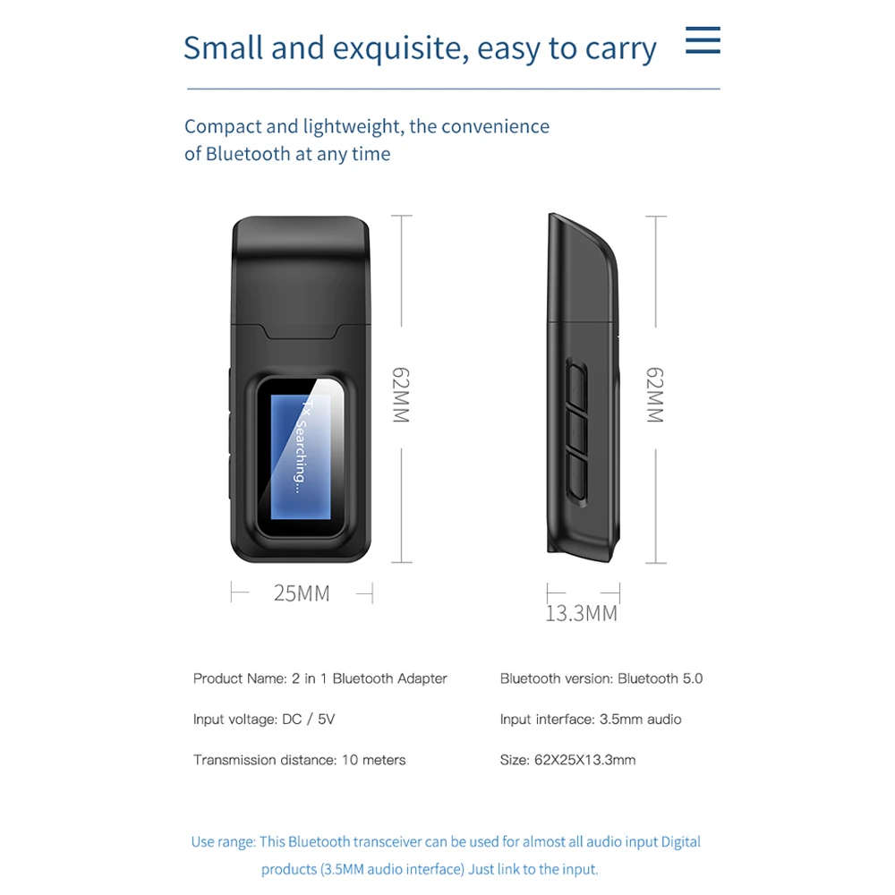Адаптер Bluetooth 2 в 1: прием и передача 2 в 1 Драйверы не требуются автоматическая Настройка («подключи и работай» Bluetooth 5,0 smart совместим встроенный подавление шума качество звука Hi-Fi; Устойчивый 10, что наши производственные мощности передачи сигнала; Полностью совместим с автоматическим распознаванием Входное напряжение: постоянный ток/5 В Вход интерфейс: 3,5 мм аудио Дальность передачи: 10 метров Драйвер: установка не требуется