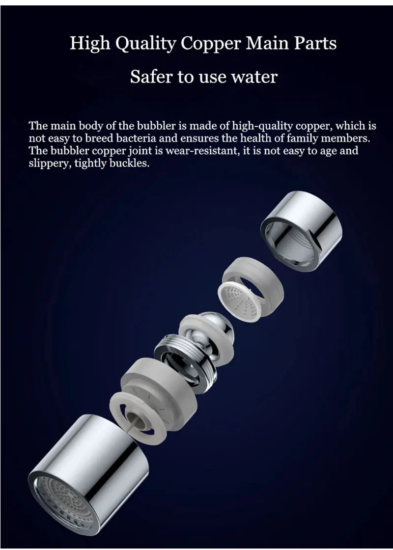 Спецификация Отруби: Diiib Размер: 46,8*28*28 мм Обработка поверхности: электропластина Вес: 39 г Рабочее давление воды: 0,05-0.8Mpa Патентный список: патент на китайское изобретение ZL201510295378.3 ,ZL201510295485.6,ZL201410087139.4 Китайский патент на полезную модель: ZL201821210041.3,ZL201520372629.9,ZL201520372734.2, zl2015203732.3, ZL201520371947.3,ZL201520371883.7, z201520375203732.3, Патент на китайский Внешний вид: ZL201630026045.6, ZL201530173761.2, ZL201530173905.4,ZL201530173736.4, ZL201530173775.4,ZL201530173834.8 * Два потока воды 1. Мягкий пузырьковый поток 2. Сильный спрей (С нежным поворотом, два режима могут быть произвольно преобразованы для удовлетворения различных потребностей в воде.) * Экономия воды: 50% ~ 80% (По сравнению с смесителем без барботера) * Функция фильтрации: Фильтр барботера также может фильтровать большую часть осадка и примесей, а внутренняя сетка может фильтровать примеси крупных частиц. Особенности: 1. Предотвращает протекание воды, и воздух смешивается с водой хорошо, вода чувствует себя мягкой, улучшенный импульс воды, очистка более удобна. 2. Тонкий, встроенный фильтр грязи захватывает песок и частицы грязи. 3. Чтобы очистить, просто снимите фильтр и снимите краску под водой. 4. Гуманизированный дизайн, прост в установке и использовании, нет необходимости заменять оригинальный кран, нет необходимости менять другие среды. 5. Вращение на 360 градусов, вода может легко покрывать всю раковину, никогда не беспокойтесь о чистке раковины в холодную зиму. 6. При условии высокой эффективности экономии воды, полностью отвечает водным требованиям для ежедневной ручной стирки, мытья посуды, мытья овощей и мытья фруктов. 7. Все используют экологически чистые материалы, безвредные, без излучения, абсолютно безопасные и надежные. 8. 17 национальных патентов, используйте больше спокойствия. Упаковка включает: 1 х барботер Монтажный ключ-1 шт. 5 x адаптер 2 х уплотнительное кольцо Руководство по эксплуатации-1 шт.