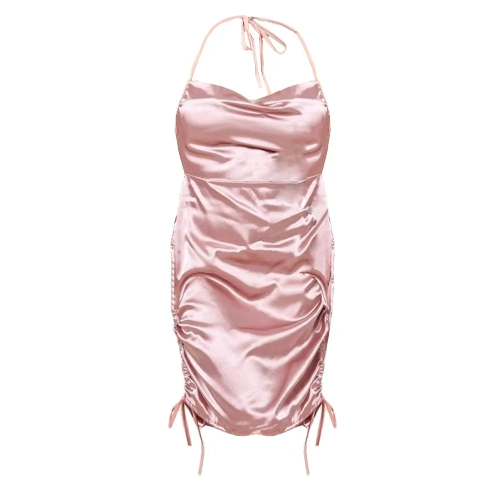 Милое женское атласное мини-платье на бретельках с рюшами и бантиком