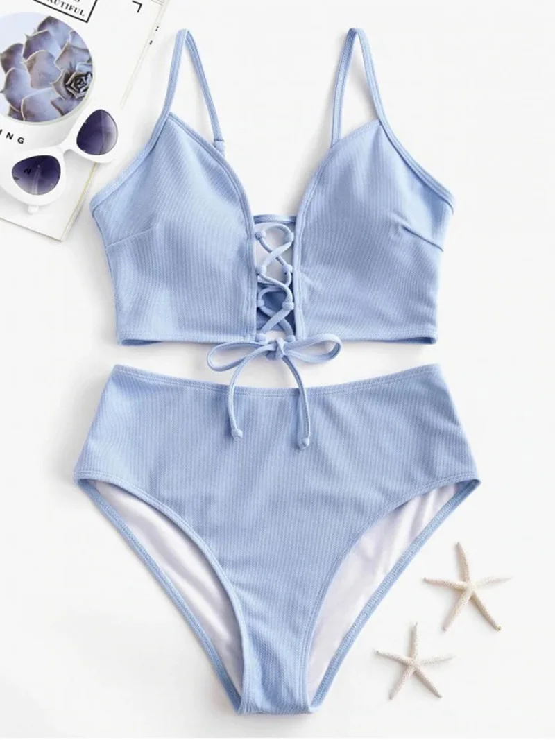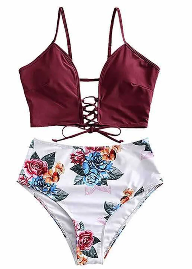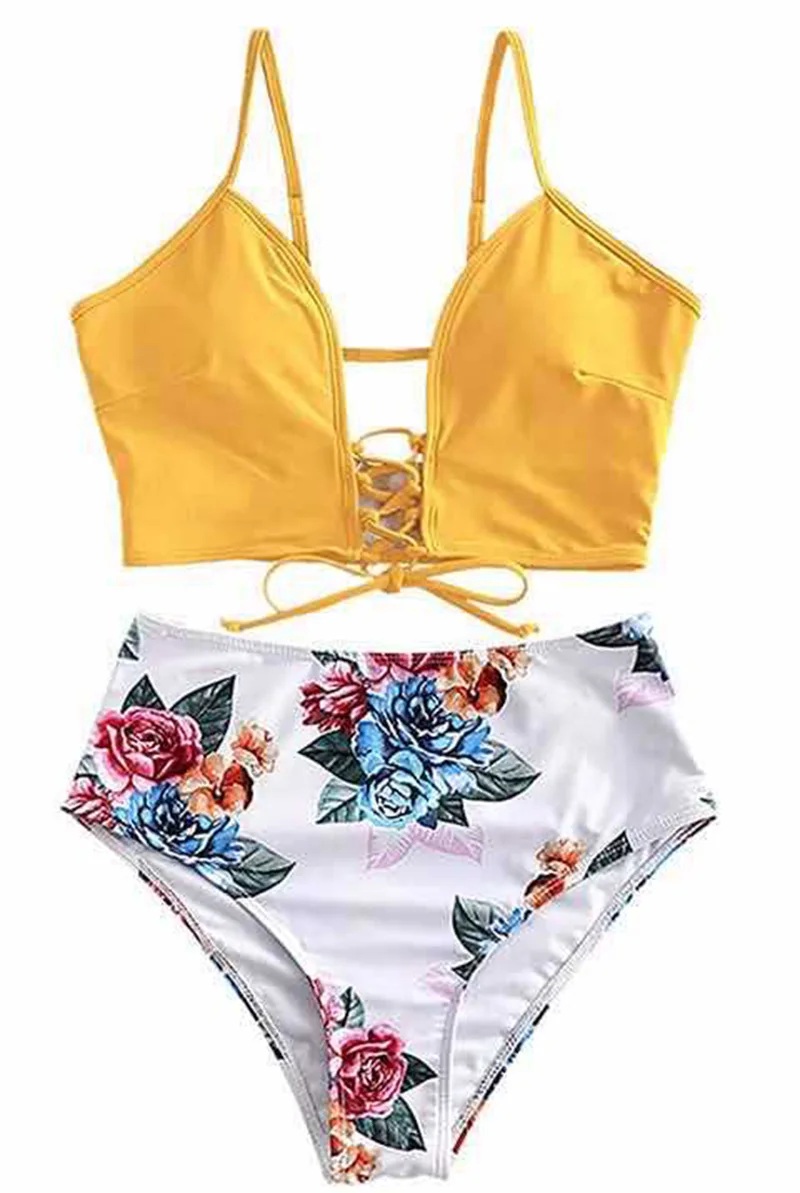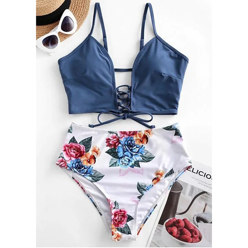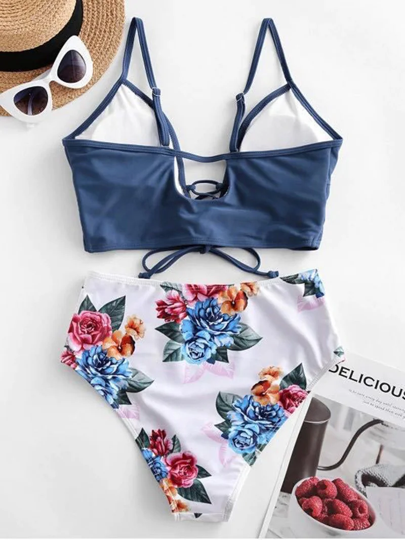 Новый Цветочный милый женский купальник Танкини, купальник с завязками и регулируемой талией для пляжа, купальник для девочек с высокой талией, купальный костюм, размер S-2XL
