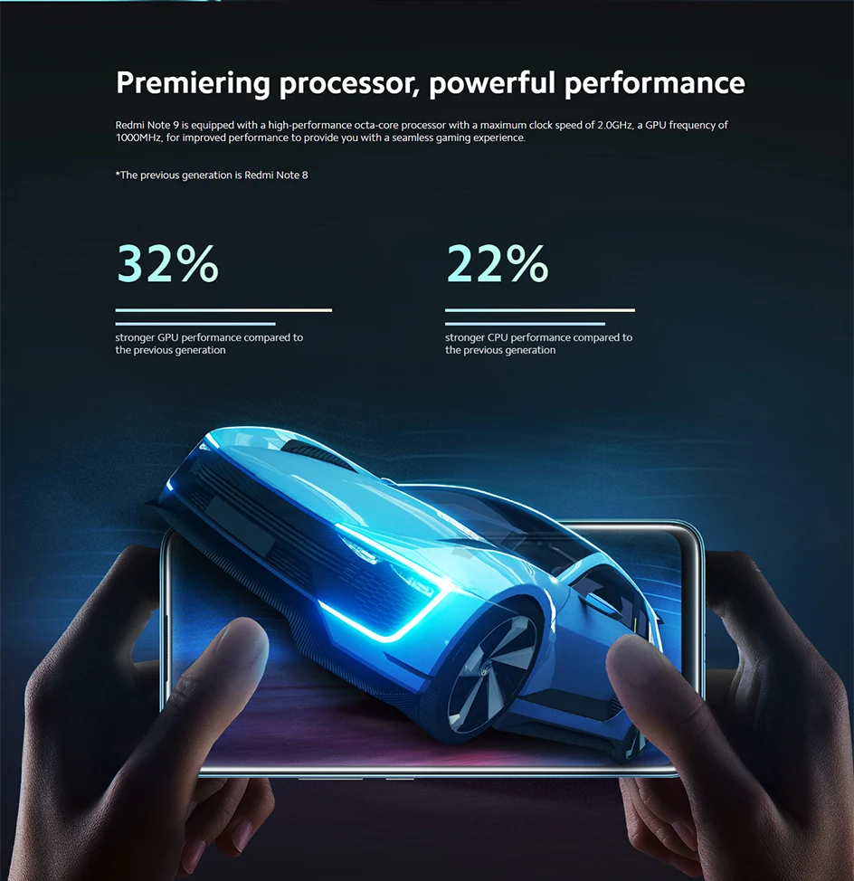 Redmi Note 9 оснащен высокопроизводительным восьмиядерным процессором с максимальной тактовой частотой 2,0 ГГц, Частота графического процессора 1000 МГц, для улучшения производительности, чтобы обеспечить вам бесшовный игровой опыт.